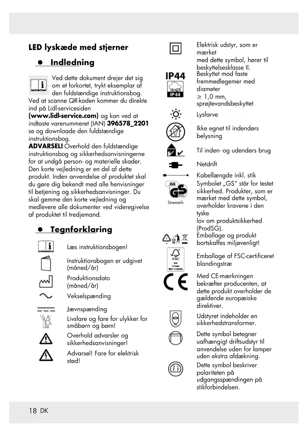 LED lyskæde med stjerner z Indledning Ved dette dokument drejer det sig om et forkortet, trykt eksemplar af den fuldstændige instruktionsbog. Ved at scanne QR-koden kommer du direkte ind på Lidl-servicesiden (www.lidl-service.com) og kan ved at indtaste varenummeret (IAN) 396578_2201 se og downloade den fuldstændige instruktionsbog. ADVARSEL! Overhold den fuldstændige instruktionsbog og sikkerhedsanvisningerne for at undgå person- og materielle skader. Den korte vejledning er en del af dette produkt. Inden anvendelse af produktet skal du gøre dig bekendt med alle henvisninger til betjening og sikkerhedsanvisninger. Du skal gemme den korte vejledning og medlevere alle dokumenter ved videregivelse af produktet til tredjemand. z Tegnforklaring Læs instruktionsbogen! Instruktionsbogen er udgivet (måned/år) Produktionsdato (måned/år) Vekselspænding Jævnspænding Livsfare og fare for ulykker for småbørn og børn! Overhold advarsler og sikkerhedsanvisninger! Advarsel! Fare for elektrisk stød! Elektrisk udstyr, som er mærket med dette symbol, hører til beskyttelsesklasse II. Beskyttet mod faste fremmedlegemer med diameter ≥ 1,0 mm, sprøjtevandsbeskyttet Lysfarve Ikke egnet til indendørs belysning Til inden- og udendørs brug Netdrift Kabellængde inkl. stik Strømstik Symbolet „GS“ står for testet sikkerhed. Produkter, som er mærket med dette symbol, overholder kravene i den tyske lov om produktsikkerhed (ProdSG). Emballage og produkt bortskaffes miljøvenligt! Emballage af FSC-certiceret blandingstræ Med CE-mærkningen bekræfter producenten, at dette produkt overholder de gældende europæiske direktiver. Udstyret indeholder en sikkerhedstransformer. Dette symbol betegner uafhængigt driftsudstyr til anvendelse uden for lamper uden ekstra afdækning. Dette symbol beskriver polariteten på udgangsspændingen på stikforbindelsen.19