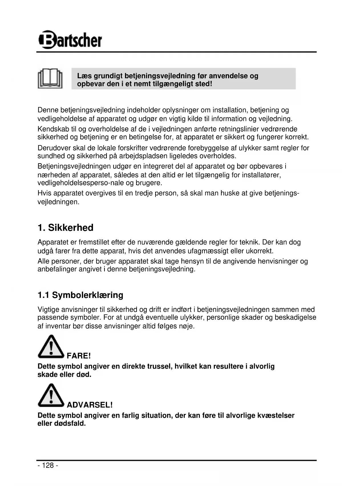 Vigtige anvisninger til sikkerhed og drift er indført i betjeningsvejledningen sammen med passende symboler. For at undgå eventuelle ulykker, personlige skader og beskadigelse af inventar bør disse anvisninger altid følges nøje. FARE! Dette symbol angiver en direkte trussel, hvilket kan resultere i alvorlig skade eller død. ADVARSEL! Dette symbol angiver en farlig situation, der kan føre til alvorlige kvæstelser eller dødsfald.- 129 -