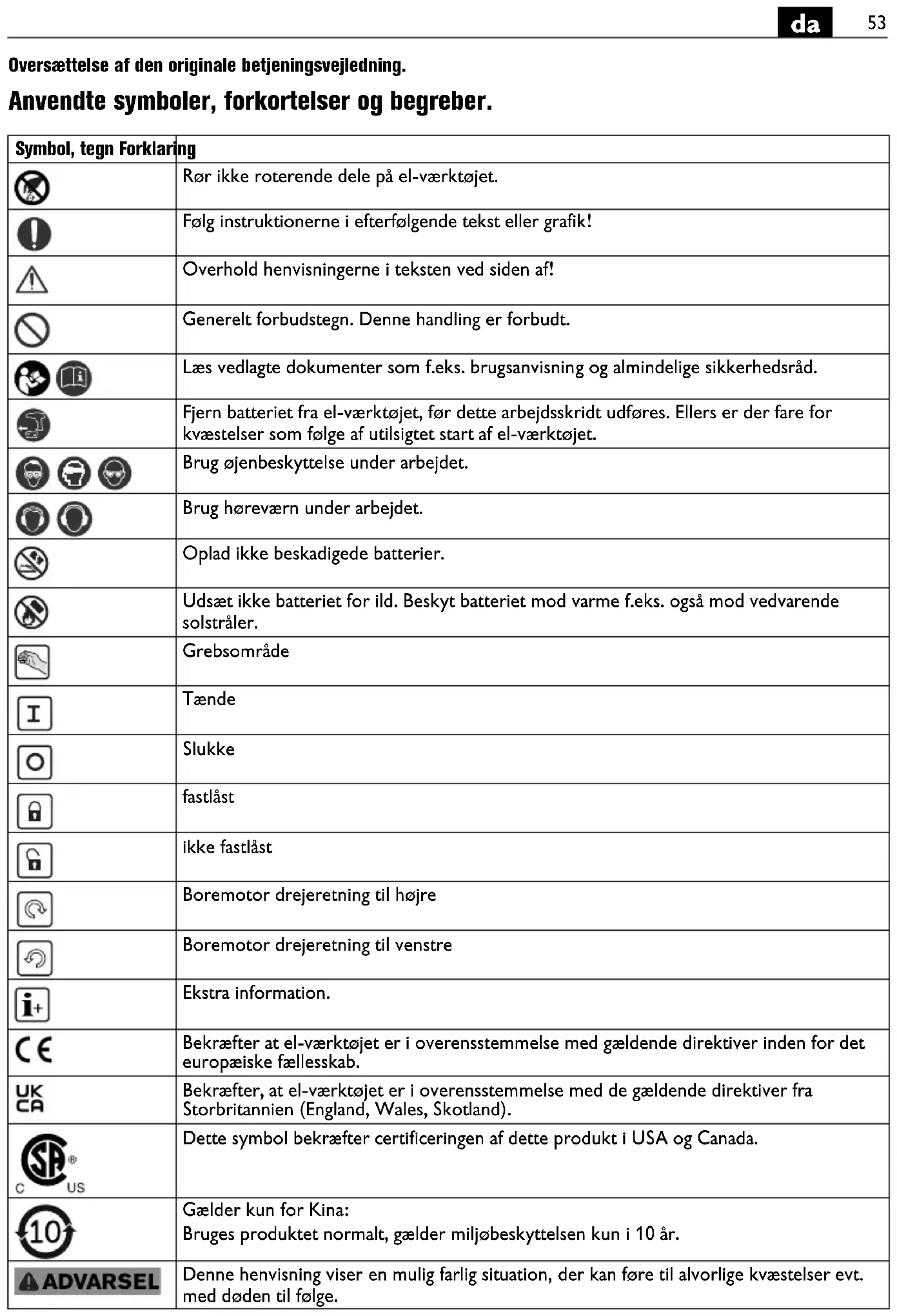 Oversættelse af den originale betjeningsvejledning. Anvendte symboler, forkortelser og begreber. Symbol, tegn Forklaring Rør ikke roterende dele på el-værktøjet. Følg instruktionerne i efterfølgende tekst eller grafik! Overhold henvisningerne i teksten ved siden af! Generelt forbudstegn. Denne handling er forbudt. Læs vedlagte dokumenter som f.eks. brugsanvisning og almindelige sikkerhedsråd. Fjern batteriet fra el-værktøjet, før dette arbejdsskridt udføres. Ellers er der fare for kvæstelser som følge af utilsigtet start af el-værktøjet. Brug øjenbeskyttelse under arbejdet. Brug høreværn under arbejdet. Oplad ikke beskadigede batterier. Udsæt ikke batteriet for ild. Beskyt batteriet mod varme f.eks. også mod vedvarende solstråler. Grebsområde Tænde Slukke fastlåst ikke fastlåst Boremotor drejeretning til højre Boremotor drejeretning til venstre Ekstra information. Bekræfter at el-værktøjet er i overensstemmelse med gældende direktiver inden for det europæiske fællesskab. Bekræfter, at el-værktøjet er i overensstemmelse med de gældende direktiver fra Storbritannien (England, Wales, Skotland). Dette symbol bekræfter certificeringen af dette produkt i USA og Canada. Gælder kun for Kina: Bruges produktet normalt, gælder miljøbeskyttelsen kun i 10 år. Denne henvisning viser en mulig farlig situation, der kan føre til alvorlige kvæstelser evt. med døden til følge.54