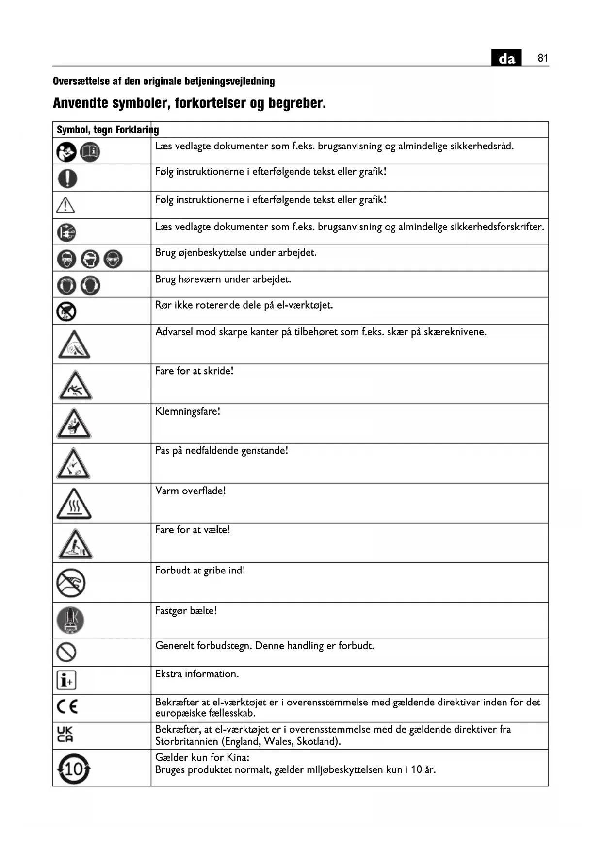 Oversættelse af den originale betjeningsvejledning Anvendte symboler, forkortelser og begreber. Symbol, tegn Forklaring Læs vedlagte dokumenter som f.eks. brugsanvisning og almindelige sikkerhedsråd. Følg instruktionerne i efterfølgende tekst eller grafik! Følg instruktionerne i efterfølgende tekst eller grafik! Læs vedlagte dokumenter som f.eks. brugsanvisning og almindelige sikkerhedsforskrifter. Brug øjenbeskyttelse under arbejdet. Brug høreværn under arbejdet. Rør ikke roterende dele på el-værktøjet. Advarsel mod skarpe kanter på tilbehøret som f.eks. skær på skæreknivene. Fare for at skride! Klemningsfare! Pas på nedfaldende genstande! Varm overflade! Fare for at vælte! Forbudt at gribe ind! Fastgør bælte! Generelt forbudstegn. Denne handling er forbudt. Ekstra information. Bekræfter at el-værktøjet er i overensstemmelse med gældende direktiver inden for det europæiske fællesskab. Bekræfter, at el-værktøjet er i overensstemmelse med de gældende direktiver fra Storbritannien (England, Wales, Skotland). Gælder kun for Kina: Bruges produktet normalt, gælder miljøbeskyttelsen kun i 10 år.82