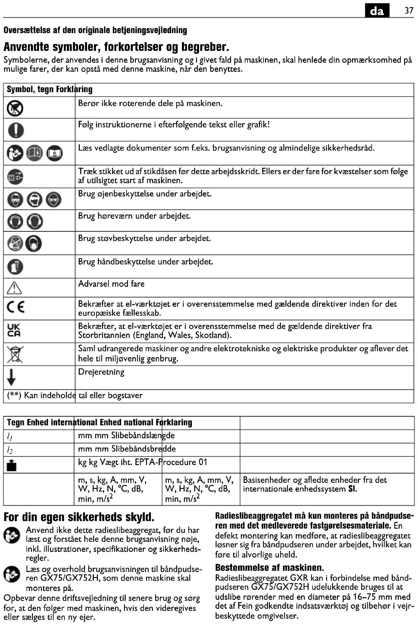 Radieslibeaggregatet GXR kan i forbindelse med band-pudseren GX75/GX752H udelukkende bruges til at udslide rørender med en diameter pa 16-75 mm med det af Fein godkendte indsatsværktog tilbehør i vejrbeskyttede omgivelser.