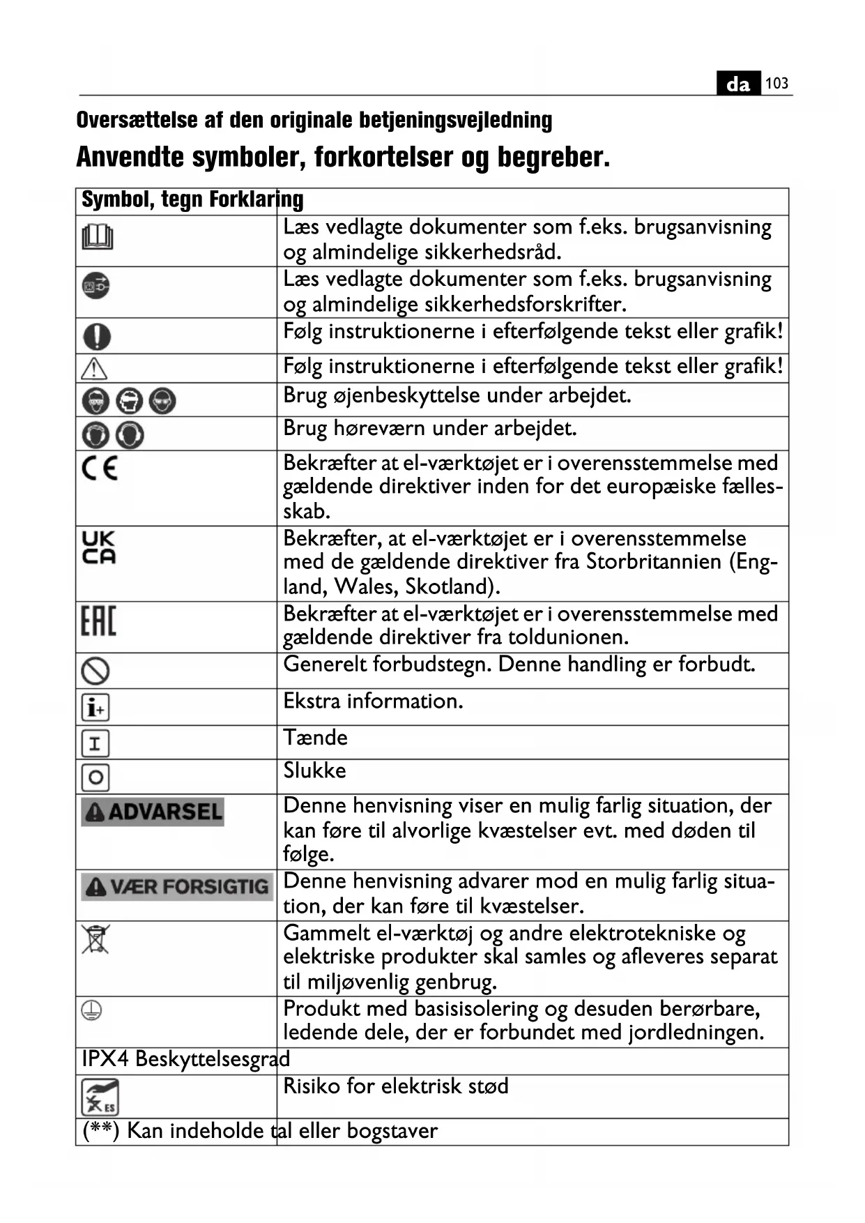 Oversættelse af den originale betjeningsvejledning Anvendte symboler, forkortelser og begreber. Symbol, tegn Forklaring Læs vedlagte dokumenter som f.eks. brugsanvisning og almindelige sikkerhedsråd. Læs vedlagte dokumenter som f.eks. brugsanvisning og almindelige sikkerhedsforskrifter. Følg instruktionerne i efterfølgende tekst eller grafik! Følg instruktionerne i efterfølgende tekst eller grafik! Brug øjenbeskyttelse under arbejdet. Brug høreværn under arbejdet. Bekræfter at el-værktøjet er i overensstemmelse med gældende direktiver inden for det europæiske fælles- skab. Bekræfter, at el-værktøjet er i overensstemmelse med de gældende direktiver fra Storbritannien (Eng- land, Wales, Skotland). Bekræfter at el-værktøjet er i overensstemmelse med gældende direktiver fra toldunionen. Generelt forbudstegn. Denne handling er forbudt. Ekstra information. Tænde Slukke Denne henvisning viser en mulig farlig situation, der kan føre til alvorlige kvæstelser evt. med døden til følge. Denne henvisning advarer mod en mulig farlig situa- tion, der kan føre til kvæstelser. Gammelt el-værktøj og andre elektrotekniske og elektriske produkter skal samles og afleveres separat til miljøvenlig genbrug. Produkt med basisisolering og desuden berørbare, ledende dele, der er forbundet med jordledningen. IPX4 Beskyttelsesgrad Risiko for elektrisk stød (**) Kan indeholde tal eller bogstaver104