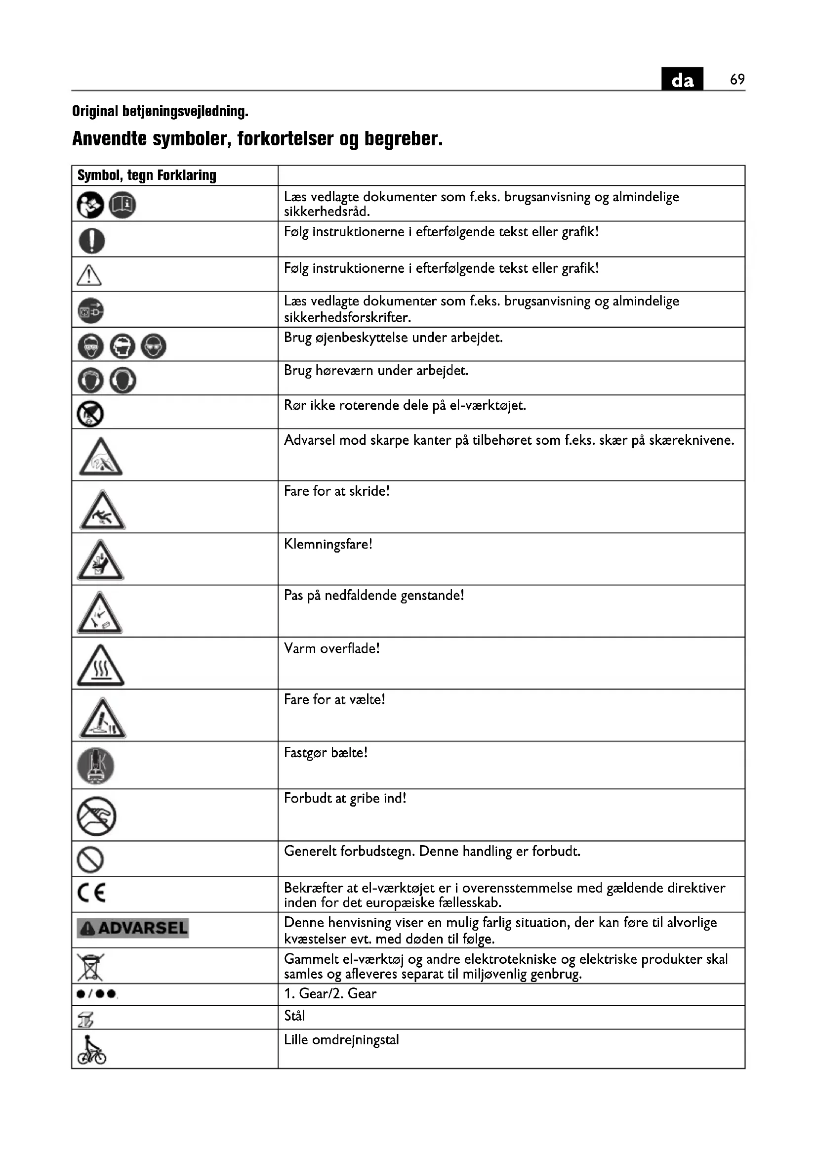 Original betjeningsvejledning. Anvendte symboler, forkortelser og begreber. Symbol, tegn Forklaring Læs vedlagte dokumenter som f.eks. brugsanvisning og almindelige sikkerhedsråd. Følg instruktionerne i efterfølgende tekst eller grafik! Følg instruktionerne i efterfølgende tekst eller grafik! Læs vedlagte dokumenter som f.eks. brugsanvisning og almindelige sikkerhedsforskrifter. Brug øjenbeskyttelse under arbejdet. Brug høreværn under arbejdet. Rør ikke roterende dele på el-værktøjet. Advarsel mod skarpe kanter på tilbehøret som f.eks. skær på skæreknivene. Fare for at skride! Klemningsfare! Pas på nedfaldende genstande! Varm overflade! Fare for at vælte! Fastgør bælte! Forbudt at gribe ind! Generelt forbudstegn. Denne handling er forbudt. Bekræfter at el-værktøjet er i overensstemmelse med gældende direktiver inden for det europæiske fællesskab. Denne henvisning viser en mulig farlig situation, der kan føre til alvorlige kvæstelser evt. med døden til følge. Gammelt el-værktøj og andre elektrotekniske og elektriske produkter skal samles og afleveres separat til miljøvenlig genbrug.