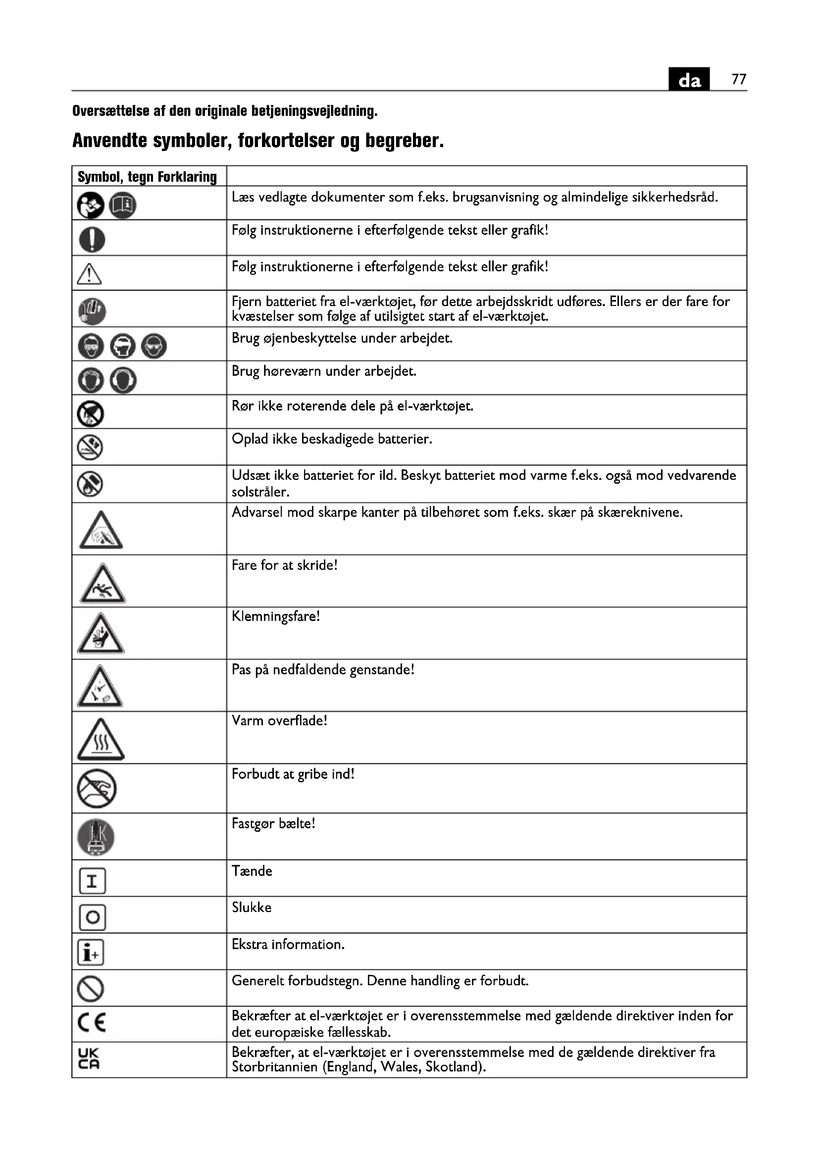Oversættelse af den originale betjeningsvejledning. Anvendte symboler, forkortelser og begreber. Symbol, tegn Forklaring Læs vedlagte dokumenter som f.eks. brugsanvisning og almindelige sikkerhedsråd. Følg instruktionerne i efterfølgende tekst eller grafik! Følg instruktionerne i efterfølgende tekst eller grafik! Fjern batteriet fra el-værktøjet, før dette arbejdsskridt udføres. Ellers er der fare for kvæstelser som følge af utilsigtet start af el-værktøjet. Brug øjenbeskyttelse under arbejdet. Brug høreværn under arbejdet. Rør ikke roterende dele på el-værktøjet. Oplad ikke beskadigede batterier. Udsæt ikke batteriet for ild. Beskyt batteriet mod varme f.eks. også mod vedvarende solstråler. Advarsel mod skarpe kanter på tilbehøret som f.eks. skær på skæreknivene. Fare for at skride! Klemningsfare! Pas på nedfaldende genstande! Varm overflade! Forbudt at gribe ind! Fastgør bælte! Tænde Slukke Ekstra information. Generelt forbudstegn. Denne handling er forbudt. Bekræfter at el-værktøjet er i overensstemmelse med gældende direktiver inden for det europæiske fællesskab. Bekræfter, at el-værktøjet er i overensstemmelse med de gældende direktiver fra Storbritannien (England, Wales, Skotland).78