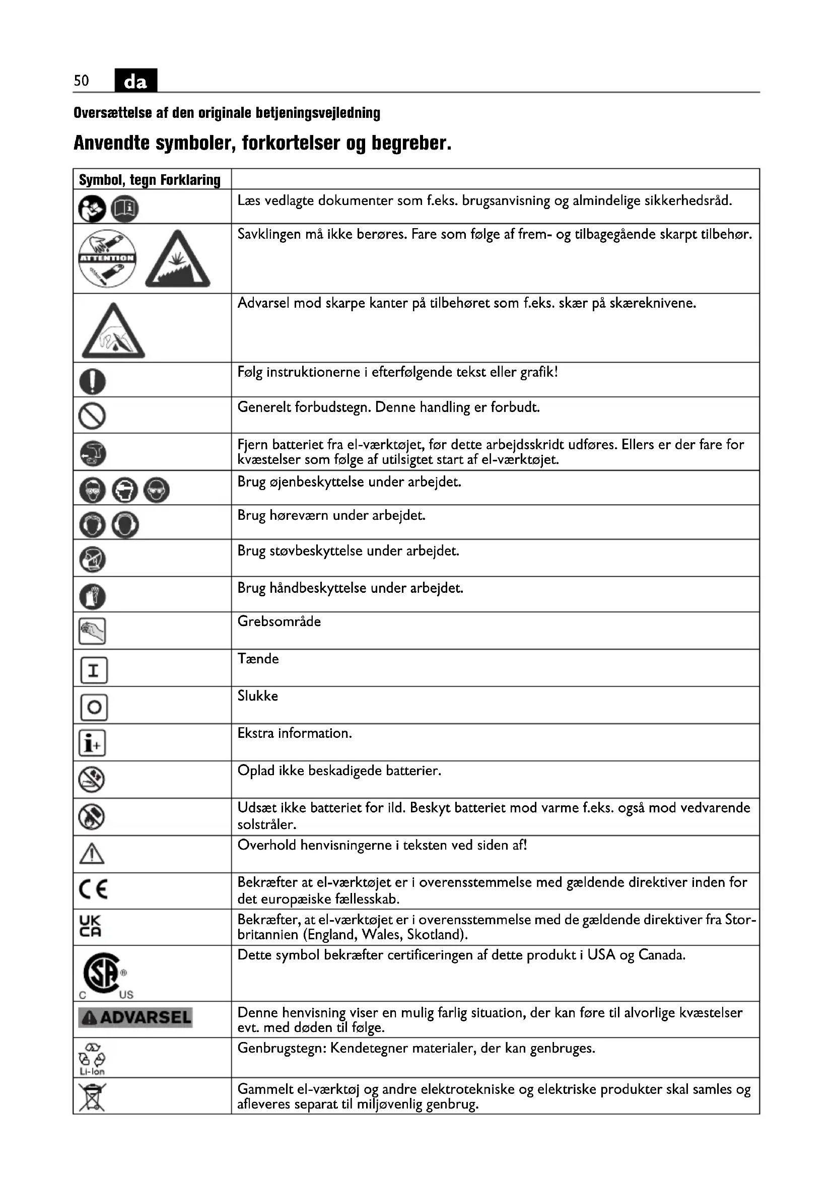 Oversættelse af den originale betjeningsvejledning Anvendte symboler, forkortelser og begreber. Symbol, tegn Forklaring Læs vedlagte dokumenter som f.eks. brugsanvisning og almindelige sikkerhedsråd. Savklingen må ikke berøres. Fare som følge af frem- og tilbagegående skarpt tilbehør. Advarsel mod skarpe kanter på tilbehøret som f.eks. skær på skæreknivene. Følg instruktionerne i efterfølgende tekst eller grafik! Generelt forbudstegn. Denne handling er forbudt. Fjern batteriet fra el-værktøjet, før dette arbejdsskridt udføres. Ellers er der fare for kvæstelser som følge af utilsigtet start af el-værktøjet. Brug øjenbeskyttelse under arbejdet. Brug høreværn under arbejdet. Brug støvbeskyttelse under arbejdet. Brug håndbeskyttelse under arbejdet. Grebsområde Tænde Slukke Ekstra information. Oplad ikke beskadigede batterier. Udsæt ikke batteriet for ild. Beskyt batteriet mod varme f.eks. også mod vedvarende solstråler. Overhold henvisningerne i teksten ved siden af! Bekræfter at el-værktøjet er i overensstemmelse med gældende direktiver inden for det europæiske fællesskab. Bekræfter, at el-værktøjet er i overensstemmelse med de gældende direktiver fra Stor- britannien (England, Wales, Skotland). Dette symbol bekræfter certificeringen af dette produkt i USA og Canada. Denne henvisning viser en mulig farlig situation, der kan føre til alvorlige kvæstelser evt. med døden til følge. Genbrugstegn: Kendetegner materialer, der kan genbruges. Gammelt el-værktøj og andre elektrotekniske og elektriske produkter skal samles og afleveres separat til miljøvenlig genbrug.51
