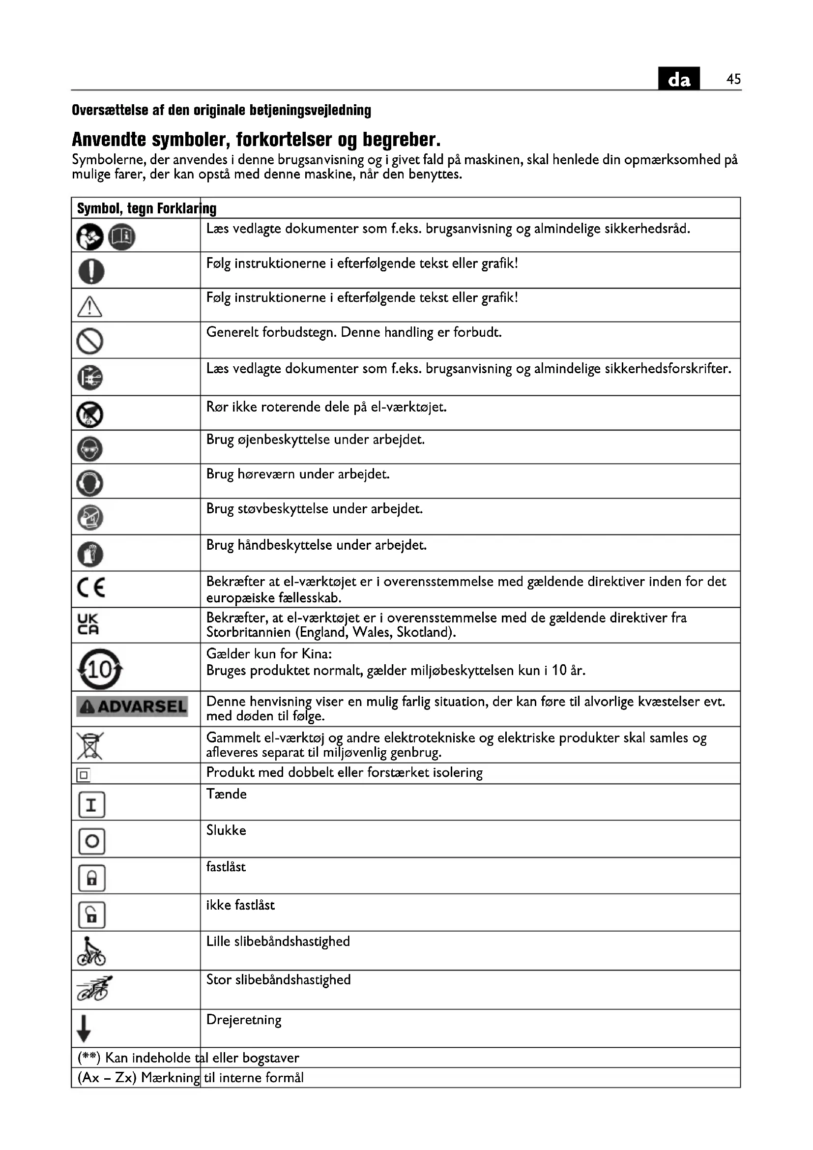 Oversættelse af den originale betjeningsvejledning Anvendte symboler, forkortelser og begreber. Symbolerne, der anvendes i denne brugsanvisning og i givet fald på maskinen, skal henlede din opmærksomhed på mulige farer, der kan opstå med denne maskine, når den benyttes. Symbol, tegn Forklaring Læs vedlagte dokumenter som f.eks. brugsanvisning og almindelige sikkerhedsråd. Følg instruktionerne i efterfølgende tekst eller grafik! Følg instruktionerne i efterfølgende tekst eller grafik! Generelt forbudstegn. Denne handling er forbudt. Læs vedlagte dokumenter som f.eks. brugsanvisning og almindelige sikkerhedsforskrifter. Rør ikke roterende dele på el-værktøjet. Brug øjenbeskyttelse under arbejdet. Brug høreværn under arbejdet. Brug støvbeskyttelse under arbejdet. Brug håndbeskyttelse under arbejdet. Bekræfter at el-værktøjet er i overensstemmelse med gældende direktiver inden for det europæiske fællesskab. Bekræfter, at el-værktøjet er i overensstemmelse med de gældende direktiver fra Storbritannien (England, Wales, Skotland). Gælder kun for Kina: Bruges produktet normalt, gælder miljøbeskyttelsen kun i 10 år. Denne henvisning viser en mulig farlig situation, der kan føre til alvorlige kvæstelser evt. med døden til følge. Gammelt el-værktøj og andre elektrotekniske og elektriske produkter skal samles og afleveres separat til miljøvenlig genbrug. Produkt med dobbelt eller forstærket isolering Tænde Slukke fastlåst ikke fastlåst Lille slibebåndshastighed Stor slibebåndshastighed Drejeretning (**) Kan indeholde tal eller bogstaver (Ax – Zx) Mærkning til interne formål46