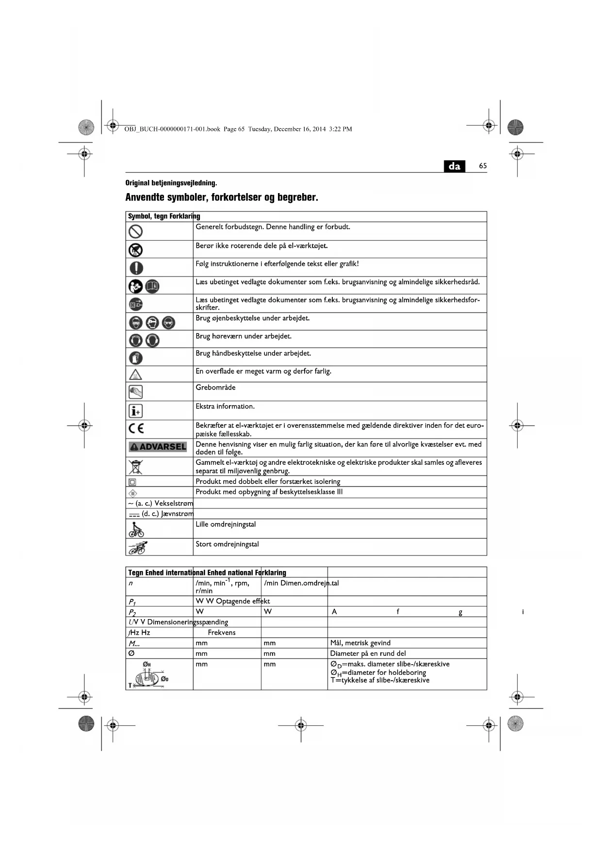 Original betjeningsvejledning. Anvendte symboler, forkortelser og begreber. Symbol, tegn Forklaring Generelt forbudstegn. Denne handling er forbudt. Berør ikke roterende dele på el-værktøjet. Følg instruktionerne i efterfølgende tekst eller grafik! Læs ubetinget vedlagte dokumenter som f.eks. brugsanvisning og almindelige sikkerhedsråd. Læs ubetinget vedlagte dokumenter som f.eks. brugsanvisning og almindelige sikkerhedsfor- skrifter. Brug øjenbeskyttelse under arbejdet. Brug høreværn under arbejdet. Brug håndbeskyttelse under arbejdet. En overflade er meget varm og derfor farlig. Grebområde Ekstra information. Bekræfter at el-værktøjet er i overensstemmelse med gældende direktiver inden for det euro- pæiske fællesskab. Denne henvisning viser en mulig farlig situation, der kan føre til alvorlige kvæstelser evt. med døden til følge. Gammelt el-værktøj og andre elektrotekniske og elektriske produkter skal samles og afleveres separat til miljøvenlig genbrug. Produkt med dobbelt eller forstærket isolering Produkt med opbygning af beskyttelsesklasse III ~ (a. c.) Vekselstrøm (d. c.) Jævnstrøm Lille omdrejningstal Stort omdrejningstal Tegn Enhed international Enhed national Forklaring