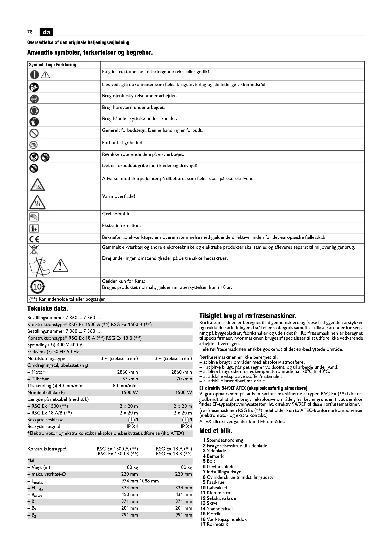 Vi gōr opmaerkomspà, at Fein rørfræsemaskinerne af typen RSG Ex (^) kke er godkend til at blive brugt i eksplíve omrader, hvilket er grunden til, at der ilkke findes EF-typeafprøvningsattester iht. direktiv 94/9EF til disse rørfræsemaskiner. (rørfræsemaskinen RSG Ex (^) indeholder kun to ATEC-konformekomponenter (elettromotor og ekstra kontakt.)