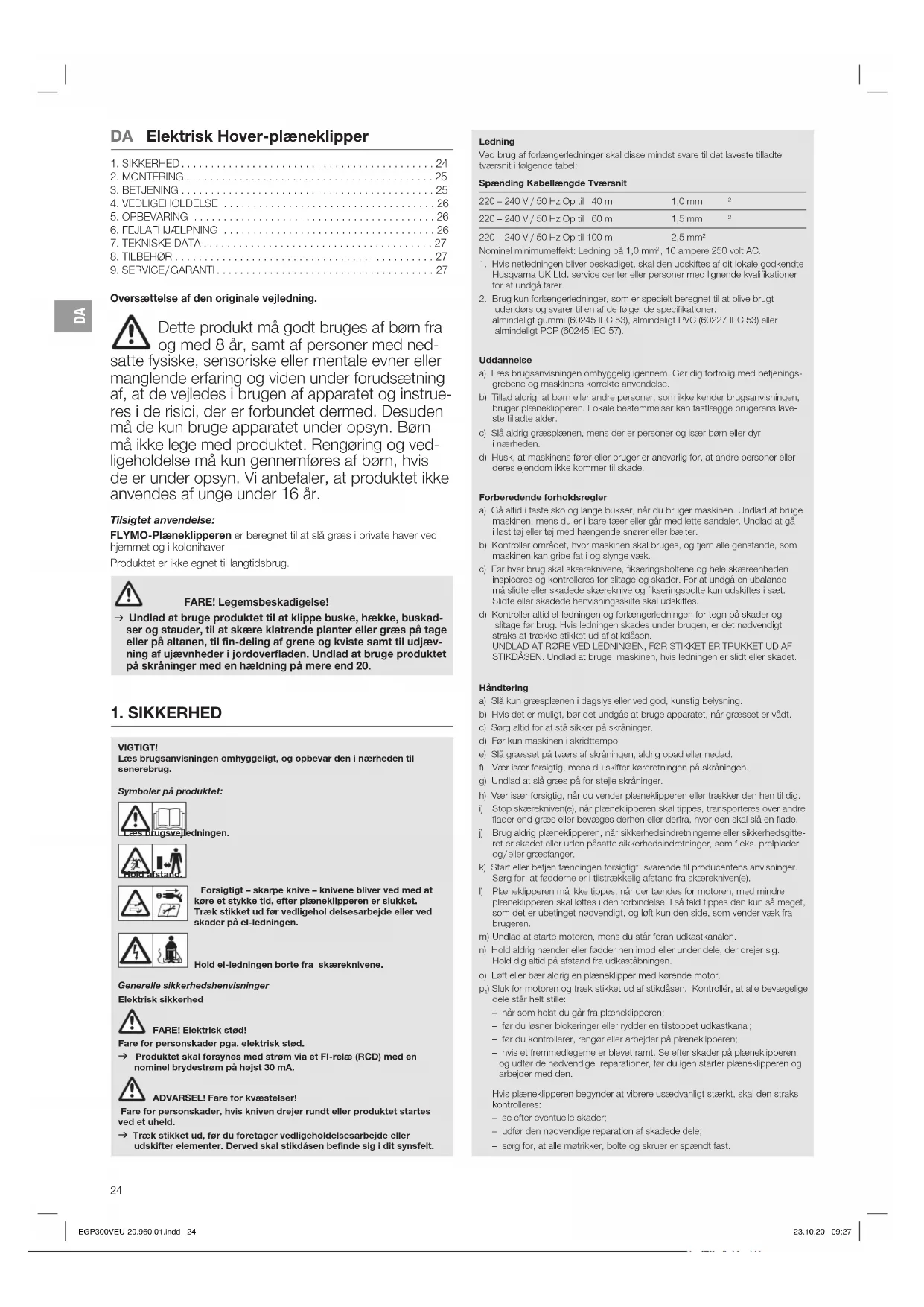 ) Sluk for motoren og træk stikket ud af stikdåsen. Kontrollér, at alle bevægelige dele står helt stille: – når som helst du går fra plæneklipperen; – før du løsner blokeringer eller rydder en tilstoppet udkastkanal; – før du kontrollerer, rengør eller arbejder på plæneklipperen; – hvis et fremmedlegeme er blevet ramt. Se efter skader på plæneklipperen og udfør de nødvendige reparationer, før du igen starter plæneklipperen og arbejder med den. Hvis plæneklipperen begynder at vibrere usædvanligt stærkt, skal den straks kontrolleres: – se efter eventuelle skader; – udfør den nødvendige reparation af skadede dele; – sørg for, at alle møtrikker, bolte og skruer er spændt fast. EGP300VEU-20.960.01.indd 24 23.10.20 09:27DA