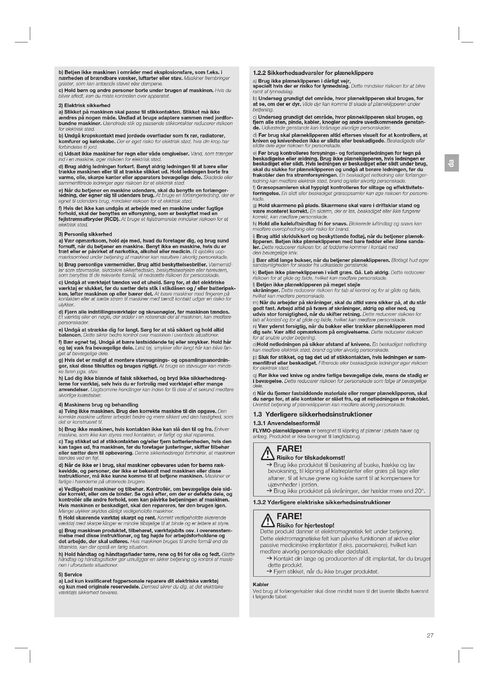 BEM/ERK: Ved alle andre driftsforstyrrelser skal du kontakte FLYMOS kundeservice. Reparationer mä kun udferes af FLYMOS kundeservice aller specialiserede forhandlere, der er godkendt af FLYMO.