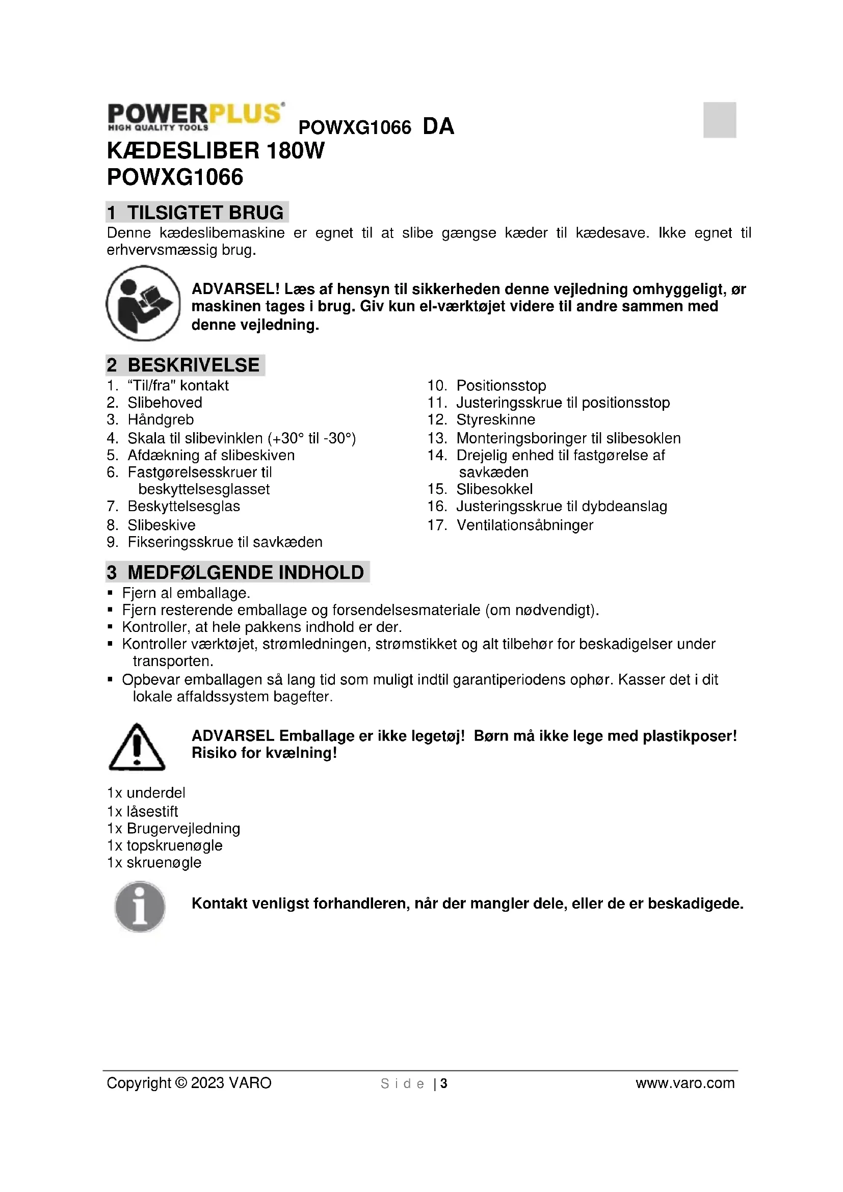 - Når tilslutningsledningen på maskinen er godt brugt, skal denne udskiftes af producenten, af dennes kundeserviceafdeling eller af en person med tilsvarende kvalifikationer og den skal udskiftes med en speciel tilslutningsledning for at undgå farer.POWXG1066 DA Copyright © 2023 VARO S i d e | 5 www.varo.com