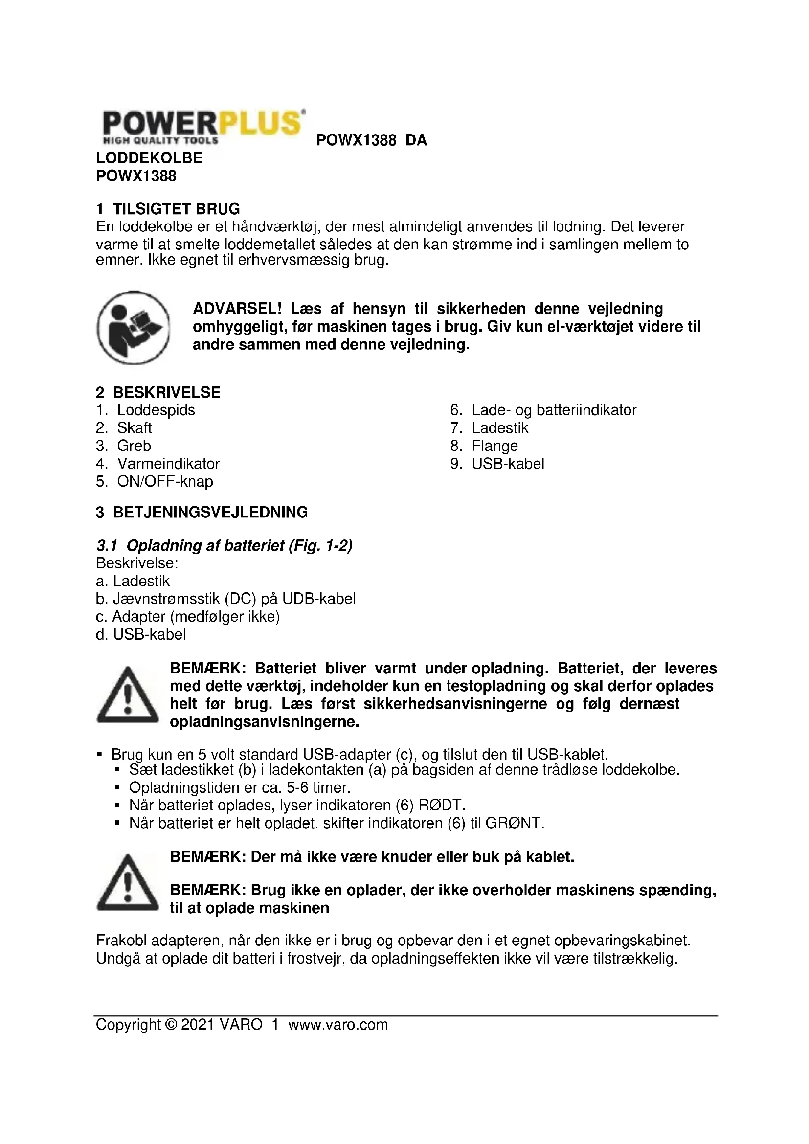 - Når batteriet er helt opladet, skifter indikatoren (6) til GRØNT. BEMÆRK: Der må ikke være knuder eller buk på kablet. BEMÆRK: Brug ikke en oplader, der ikke overholder maskinens spænding, til at oplade maskinen Frakobl adapteren, når den ikke er i brug og opbevar den i et egnet opbevaringskabinet. Undgå at oplade dit batteri i frostvejr, da opladningseffekten ikke vil være tilstrækkelig.POWX1388 DA Copyright © 2021 VARO 2 www.varo.com BEMÆRK: Hvis værktøjet ikke skal bruges i lange perioder, skal du oplade batteriet hver 3-6 måned. BEMÆRK: For at forhindre beskadigelse af batteriet skal du oplade batteriet, når det er opbrugt, for at det er fuldt eller ikke mindre end halvt opladet inden opbevaring.