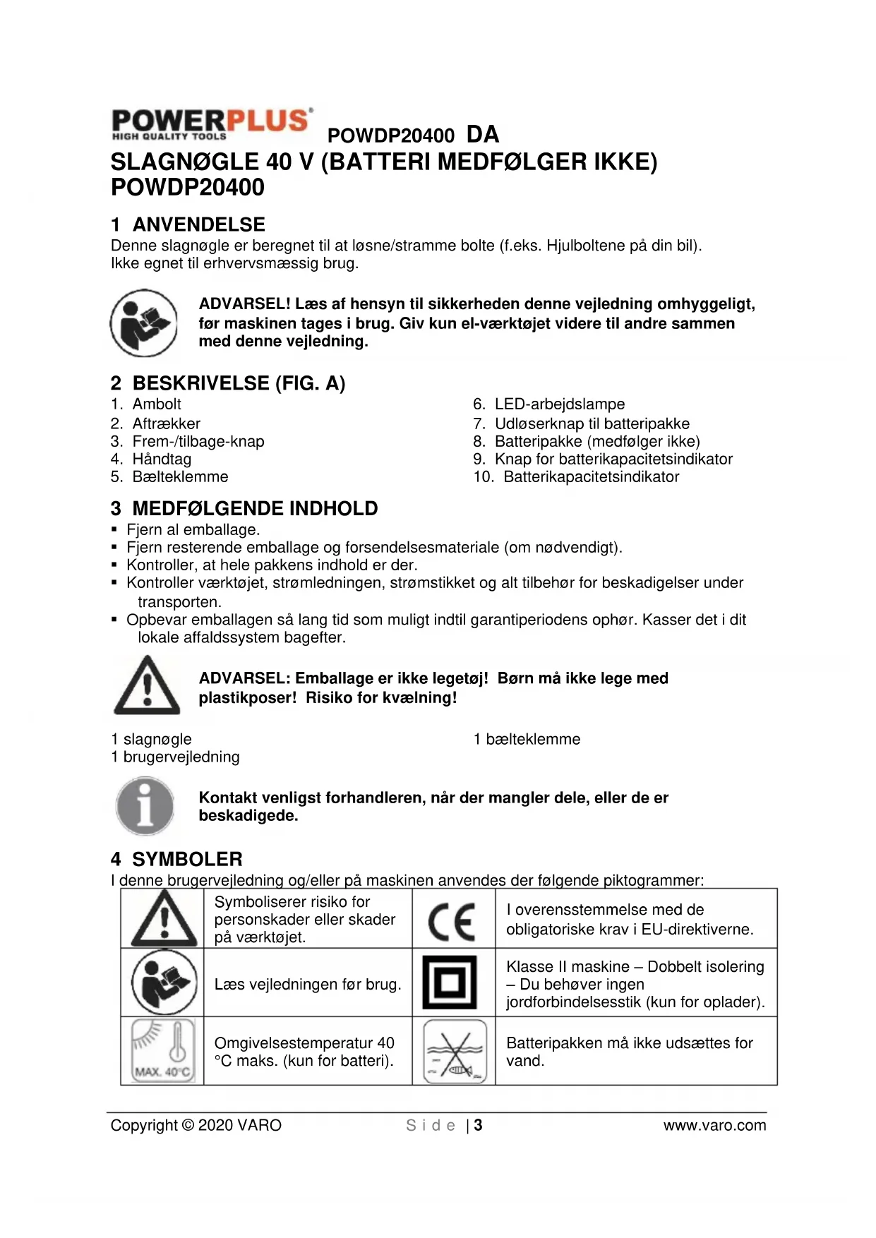 Batteripakken må ikke udsættes for vand.POWDP20400 DA Copyright © 2020 VARO S i d e | 4 www.varo.com