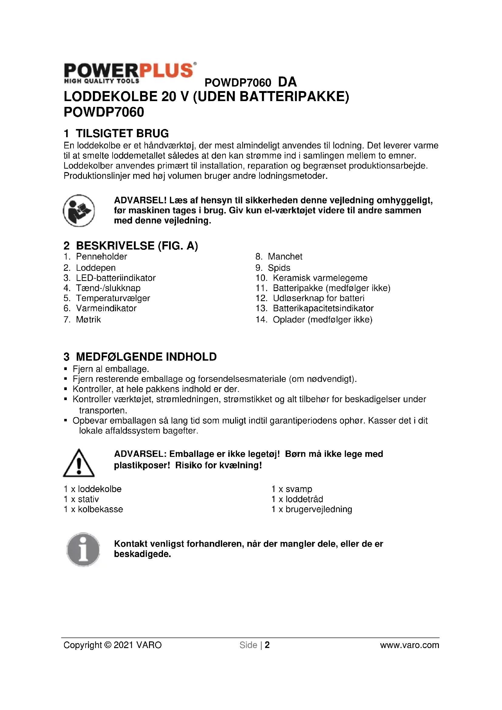 Copyright © 2021 VARO Side | 2 www.varo.com LODDEKOLBE 20 V (UDEN BATTERIPAKKE) POWDP7060 1 TILSIGTET BRUG En loddekolbe er et håndværktøj, der mest almindeligt anvendes til lodning. Det leverer varme til at smelte loddemetallet således at den kan strømme ind i samlingen mellem to emner. Loddekolber anvendes primært til installation, reparation og begrænset produktionsarbejde. Produktionslinjer med høj volumen bruger andre lodningsmetoder. ADVARSEL! Læs af hensyn til sikkerheden denne vejledning omhyggeligt, før maskinen tages i brug. Giv kun el-værktøjet videre til andre sammen med denne vejledning. 2 BESKRIVELSE (FIG. A)