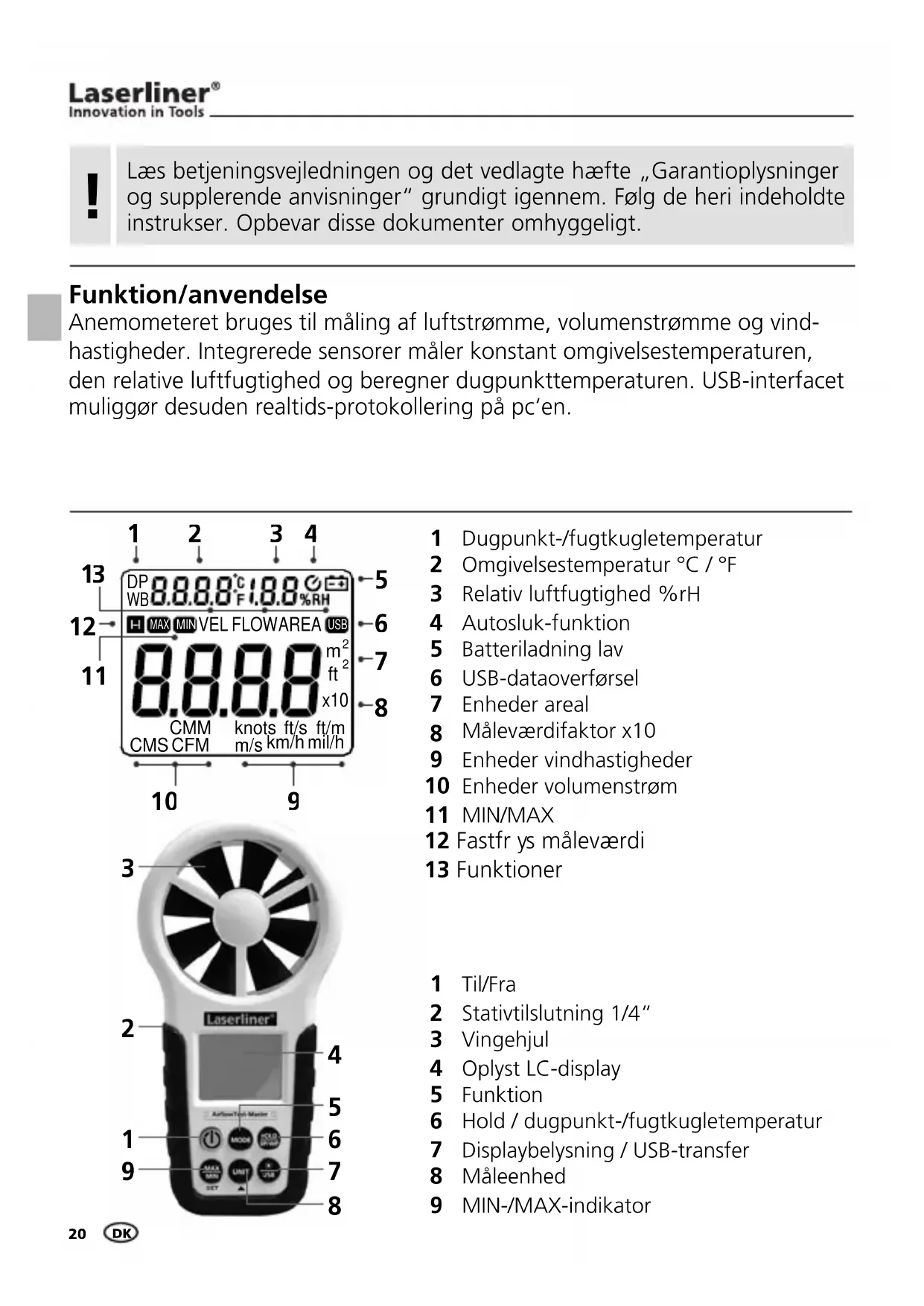 s måleværdi 13 Funktioner Funktion/anvendelse Anemometeret bruges til måling af luftstrømme, volumenstrømme og vind- hastigheder. Integrerede sensorer måler konstant omgivelsestemperaturen, den relative luftfugtighed og beregner dugpunkttemperaturen. USB-interfacet muliggør desuden realtids-protokollering på pc‘en. Læs betjeningsvejledningen og det vedlagte hæfte „Garantioplysninger og supplerende anvisninger“ grundigt igennem. Følg de heri indeholdte instrukser. Opbevar disse dokumenter omhyggeligt.