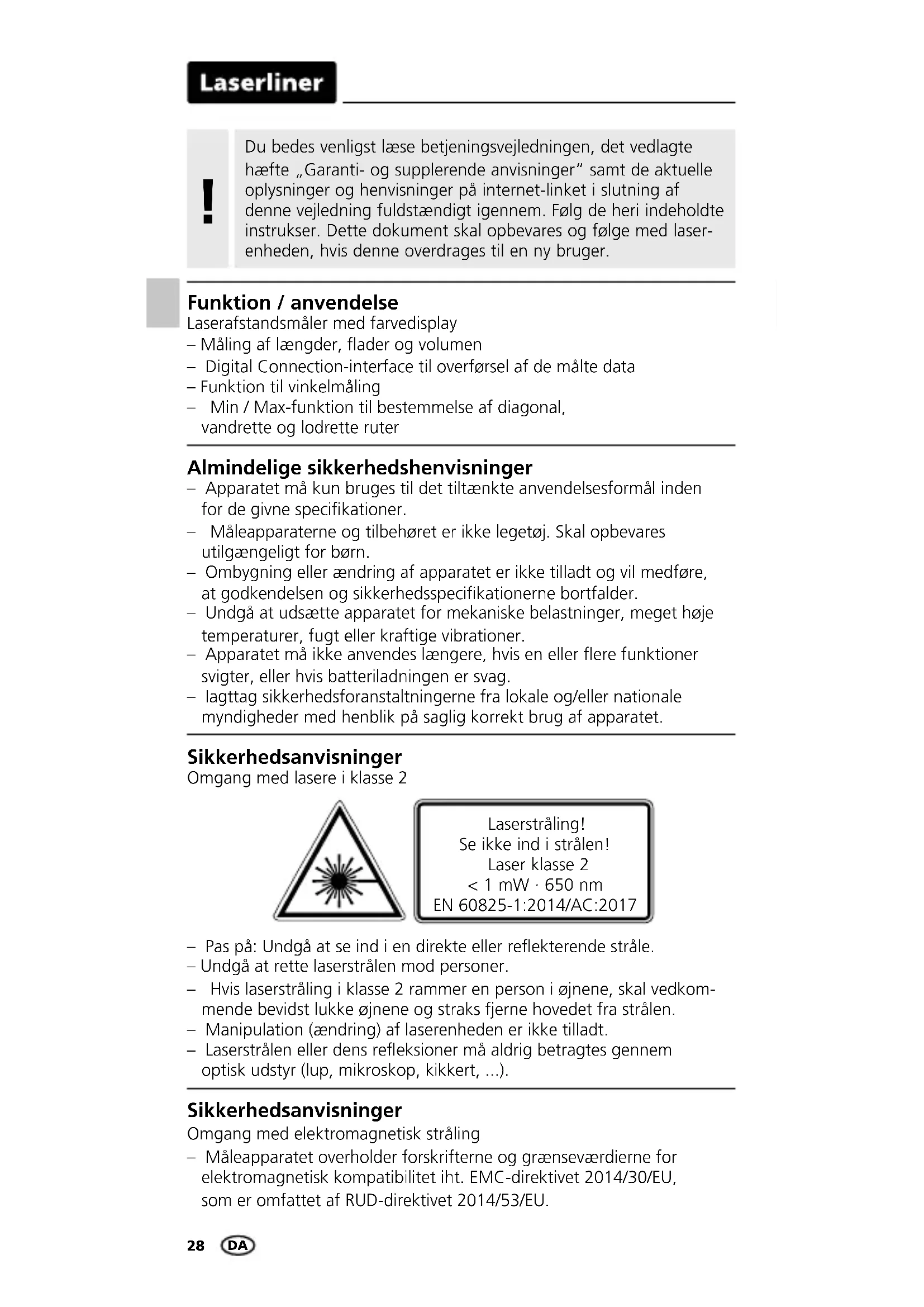 - tot 10 m meetafstand bij goed reflecterend doeloppervlak en bij ruimtetemperatuur. Bij grotere afstanden en ongunstige meetvoor- waarden, zoals sterke zonnestraling of zwak reflecterende doelopper- vlakken, kan de meetafwijking ± 2 mm/m groter worden. Technische gegevens (Technische veranderingen voorbehouden) Automatische uitschakeling 30 sec. laser / 3 min. apparaat Stroomverzorging 2 x 1,5V LR03 (AAA) Afmetingen (B x H x D) 43 x 110 x 27 mm Gewicht 100 g (incl. batterijen) NL28 – Måleapparatet overholder forskrifterne og grænseværdierne for elektromagnetisk kompatibilitet iht. EMC-direktivet 2014/30/EU, som er omfattet af RUD-direktivet 2014/53/EU. Sikkerhedsanvisninger Omgang med elektromagnetisk stråling – Pas på: Undgå at se ind i en direkte eller reekterende stråle. – Undgå at rette laserstrålen mod personer. – Hvis laserstråling i klasse 2 rammer en person i øjnene, skal vedkom- mende bevidst lukke øjnene og straks fjerne hovedet fra strålen. – Manipulation (ændring) af laserenheden er ikke tilladt. – Laserstrålen eller dens reeksioner må aldrig betragtes gennem optisk udstyr (lup, mikroskop, kikkert, ...). Sikkerhedsanvisninger Omgang med lasere i klasse 2 Almindelige sikkerhedshenvisninger – Apparatet må kun bruges til det tiltænkte anvendelsesformål inden for de givne specikationer. – Måleapparaterne og tilbehøret er ikke legetøj. Skal opbevares utilgængeligt for børn. – Ombygning eller ændring af apparatet er ikke tilladt og vil medføre, at godkendelsen og sikkerhedsspecikationerne bortfalder. – Undgå at udsætte apparatet for mekaniske belastninger, meget høje temperaturer, fugt eller kraftige vibrationer. – Apparatet må ikke anvendes længere, hvis en eller ere funktioner svigter, eller hvis batteriladningen er svag. – Iagttag sikkerhedsforanstaltningerne fra lokale og/eller nationale myndigheder med henblik på saglig korrekt brug af apparatet. Funktion / anvendelse Laserafstandsmåler med farvedisplay – Måling af længder, ader og volumen – Digital Connection-interface til overførsel af de målte data – Funktion til vinkelmåling – Min / Max-funktion til bestemmelse af diagonal, vandrette og lodrette ruter Du bedes venligst læse betjeningsvejledningen, det vedlagte hæfte „Garanti- og supplerende anvisninger“ samt de aktuelle oplysninger og henvisninger på internet-linket i slutning af denne vejledning fuldstændigt igennem. Følg de heri indeholdte instrukser. Dette dokument skal opbevares og følge med laser- enheden, hvis denne overdrages til en ny bruger.