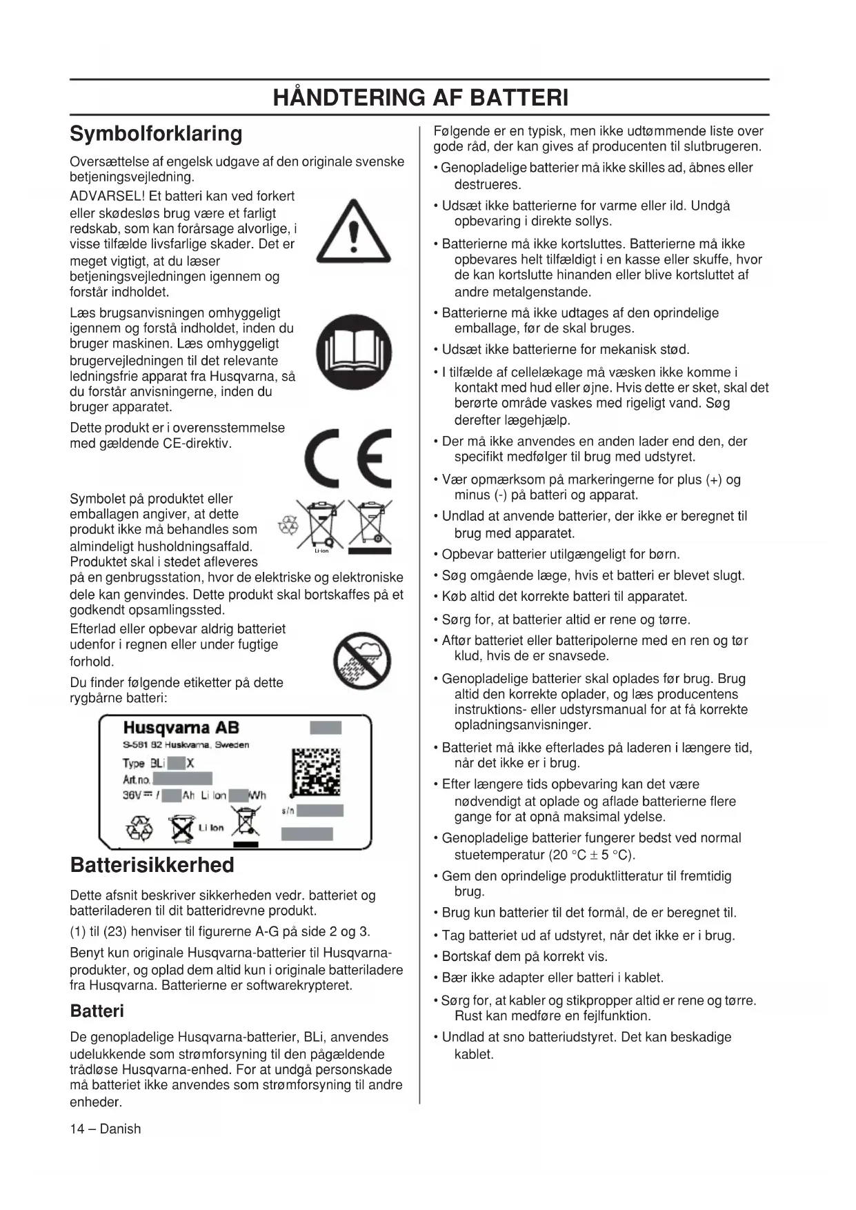 14 – Danish Symbolforklaring Oversættelse af engelsk udgave af den originale svenske betjeningsvejledning. ADVARSEL! Et batteri kan ved forkert eller skødesløs brug være et farligt redskab, som kan forårsage alvorlige, i visse tilfælde livsfarlige skader. Det er meget vigtigt, at du læser betjeningsvejledningen igennem og forstår indholdet. Læs brugsanvisningen omhyggeligt igennem og forstå indholdet, inden du bruger maskinen. Læs omhyggeligt brugervejledningen til det relevante ledningsfrie apparat fra Husqvarna, så du forstår anvisningerne, inden du bruger apparatet. Dette produkt er i overensstemmelse med gældende CE-direktiv. Symbolet på produktet eller emballagen angiver, at dette produkt ikke må behandles som almindeligt husholdningsaffald. Produktet skal i stedet afleveres på en genbrugsstation, hvor de elektriske og elektroniske dele kan genvindes. Dette produkt skal bortskaffes på et godkendt opsamlingssted. Efterlad eller opbevar aldrig batteriet udenfor i regnen eller under fugtige forhold. Du finder følgende etiketter på dette rygbårne batteri: Batterisikkerhed Dette afsnit beskriver sikkerheden vedr. batteriet og batteriladeren til dit batteridrevne produkt. (1) til (23) henviser til figurerne A-G på side 2 og 3. Benyt kun originale Husqvarna-batterier til Husqvarna- produkter, og oplad dem altid kun i originale batteriladere fra Husqvarna. Batterierne er softwarekrypteret. Batteri De genopladelige Husqvarna-batterier, BLi, anvendes udelukkende som strømforsyning til den pågældende trådløse Husqvarna-enhed. For at undgå personskade må batteriet ikke anvendes som strømforsyning til andre enheder. Følgende er en typisk, men ikke udtømmende liste over gode råd, der kan gives af producenten til slutbrugeren.