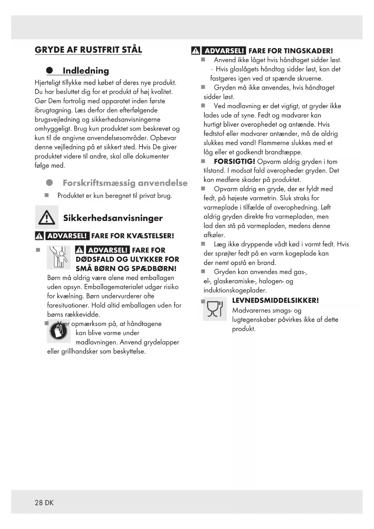 SMÅ BØRN OG SPÆDBØRN! Børn må aldrig være alene med emballagen uden opsyn. Emballagematerialet udgør risiko for kvælning. Børn undervurderer ofte faresituationer. Hold altid emballagen uden for børns rækkevidde. Vær opmærksom på, at håndtagene kan blive varme under madlavningen. Anvend grydelapper eller grillhandsker som beskyttelse. ADVARSEL! FARE FOR TINGSKADER! Anvend ikke låget hvis håndtaget sidder løst. – Hvis glaslågets håndtag sidder løst, kan det fastgøres igen ved at spænde skruerne. Gryden må ikke anvendes, hvis håndtaget sidder løst. Ved madlavning er det vigtigt, at gryder ikke lades ude af syne. Fedt og madvarer kan hurtigt bliver overophedet og antænde. Hvis fedtstof eller madvarer antænder, må de aldrig slukkes med vand! Flammerne slukkes med et låg eller et godkendt brandtæppe. FORSIGTIG! Opvarm aldrig gryden i tom tilstand. I modsat fald overopheder gryden. Det kan medføre skader på produktet. Opvarm aldrig en gryde, der er fyldt med fedt, på højeste varmetrin. Sluk straks for varmeplade i tilfælde af overophedning. Løft aldrig gryden direkte fra varmepladen, men lad den stå på varmepladen, medens denne afkøler. Læg ikke dryppende vådt kød i varmt fedt. Hvis der sprøjter fedt på en varm kogeplade kan der nemt opstå en brand. Gryden kan anvendes med gas-, el-, glaskeramiske-, halogen- og induktionskogeplader.
