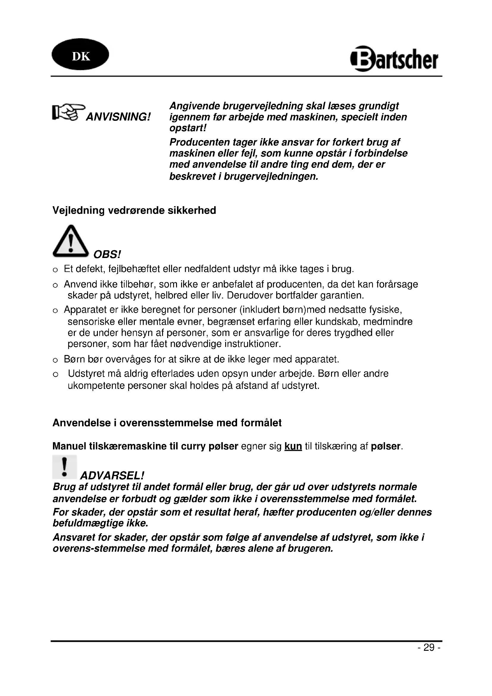 Angivende brugervejledning skal læses grundigt igennem før arbejde med maskinen, specielt inden opstart! Producenten tager ikke ansvar for forkert brug af maskinen eller fejl, som kunne opstår i forbindelse med anvendelse til andre ting end dem, der er beskrevet i brugervejledningen.