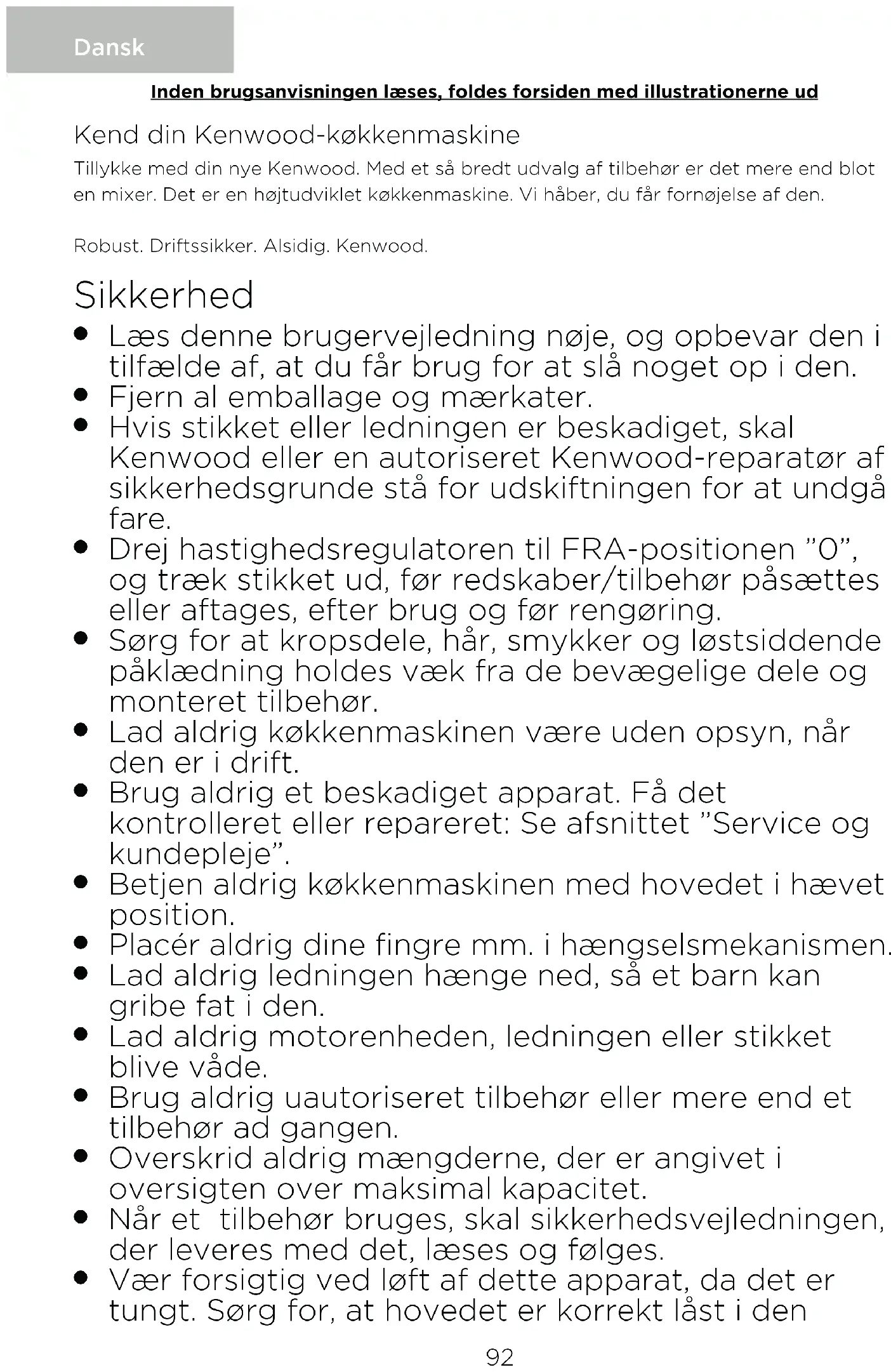 Vær forsigtig ved løft af dette apparat, da det er tungt. Sørg for, at hovedet er korrekt låst i den Dansk Inden brugsanvisningen læses, foldes forsiden med illustrationerne ud 92nedadpegende position, og at skålen, redskaberne, udtagsdækslerne og ledningen er fastgjort før løft.