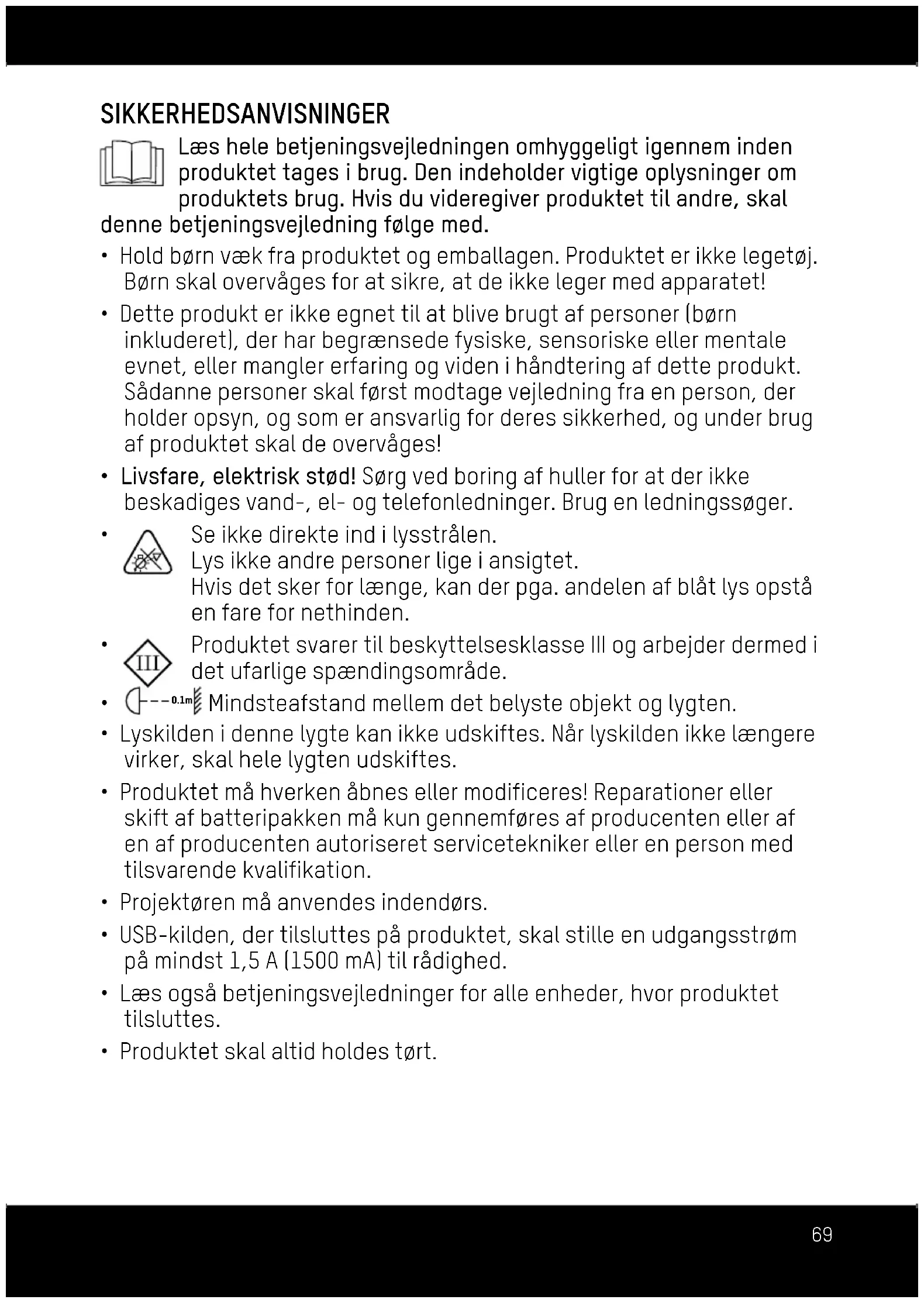 - Produktet må hverken åbnes eller modificeres! Reparationer eller skift af batteripakken må kun gennemføres af producenten eller af en af producenten autoriseret servicetekniker eller en person med tilsvarende kvalifikation.