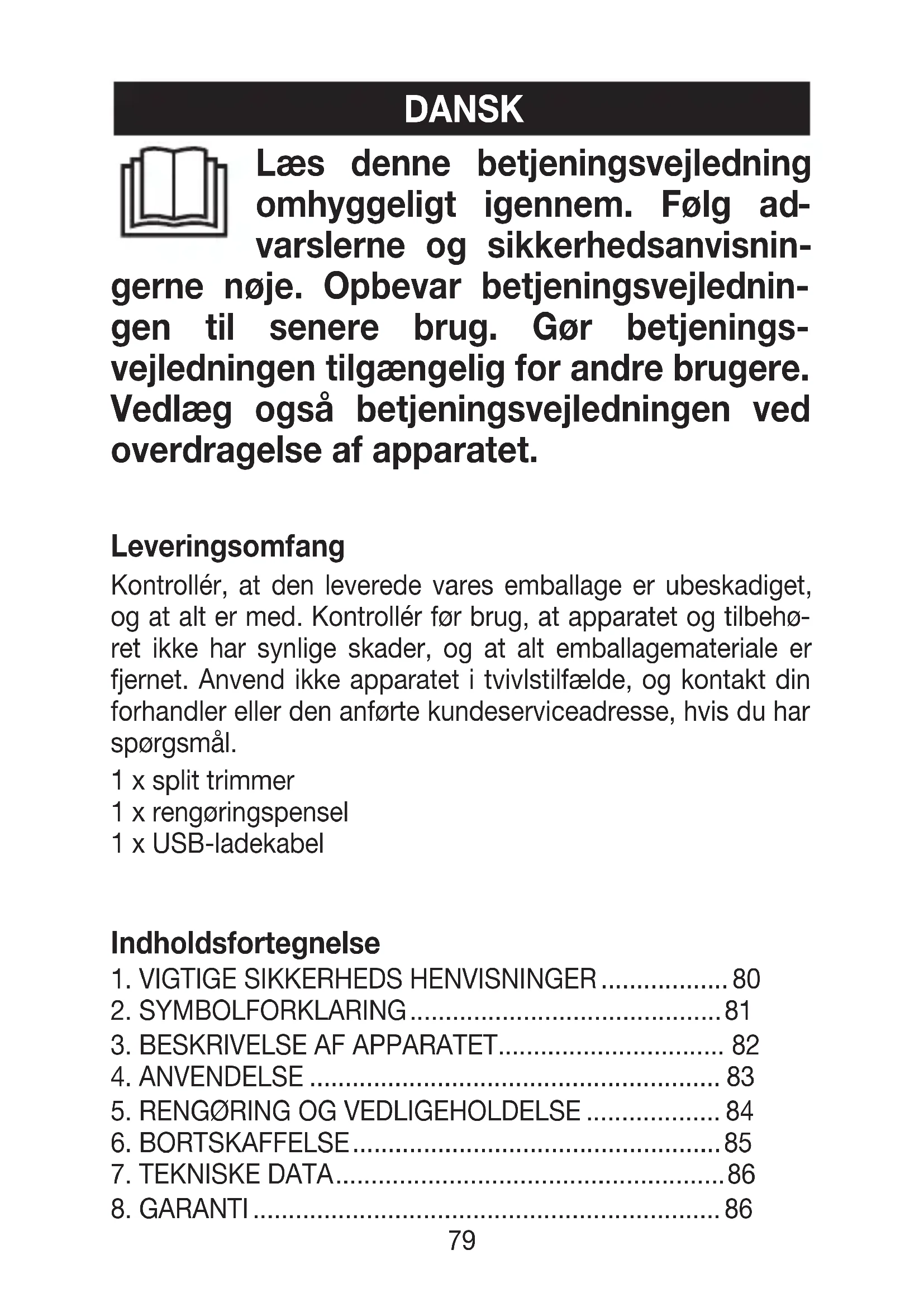ret ikke har synlige skader, og at alt emballagemateriale er fjernet. Anvend ikke apparatet i tvivlstilfælde, og kontakt din forhandler eller den anførte kundeserviceadresse, hvis du har spørgsmål. 1 x split trimmer 1 x rengøringspensel 1 x USB-ladekabel80