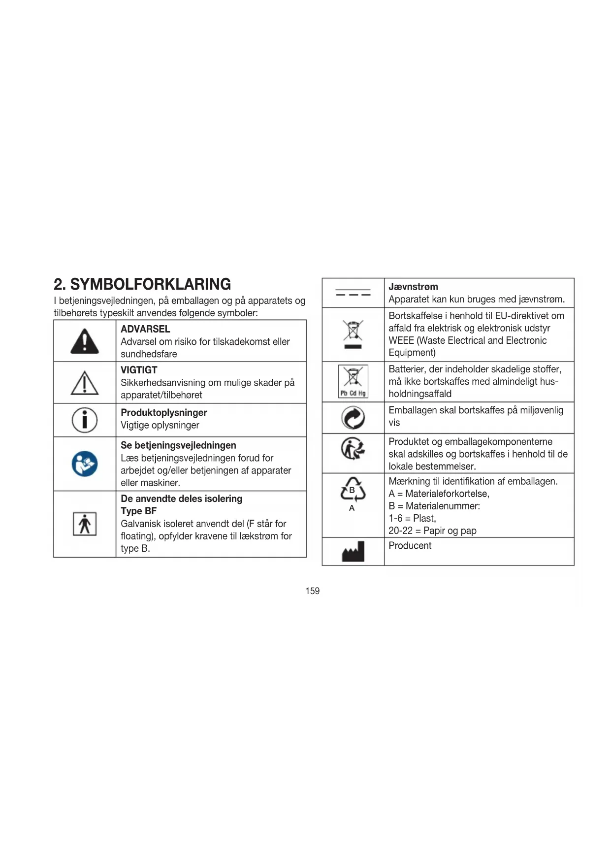 Kontrollér, at den leverede vares emballage er ubeskadiget, og at alt er med. Kontrollér før brug, at apparatet og tilbehø- ret ikke har synlige skader, og at alt emballagemateriale er fjernet. Anvend ikke apparatet i tvivlstilfælde, og kontakt din forhandler eller den anførte kundeserviceadresse, hvis du har spørgsmål. 1x blodtryksmåler med manchet 2x 1,5V AAA-batterier LR03 1x opbevaringsboks 1x betjeningsvejledning 1582. SYMBOLFORKLARING I betjeningsvejledningen, på emballagen og på apparatets og tilbehørets typeskilt anvendes følgende symboler: ADVARSEL Advarsel om risiko for tilskadekomst eller sundhedsfare VIGTIGT Sikkerhedsanvisning om mulige skader på apparatet/tilbehøret Produktoplysninger Vigtige oplysninger Se betjeningsvejledningen Læs betjeningsvejledningen forud for arbejdet og/eller betjeningen af apparater eller maskiner. De anvendte deles isolering Type BF Galvanisk isoleret anvendt del (Fstår for floating), opfylder kravene til lækstrøm for type B. Jævnstrøm Apparatet kan kun bruges med jævnstrøm. Bortskaelse i henhold til EU-direktivet om aald fra elektrisk og elektronisk udstyr WEEE (Waste Electrical and Electronic Equipment) Batterier, der indeholder skadelige stoer, må ikke bortskaes med almindeligt hus- holdningsaald Emballagen skal bortskaes på miljøvenlig vis Produktet og emballagekomponenterne skal adskilles og bortskaes i henhold til de lokale bestemmelser.
