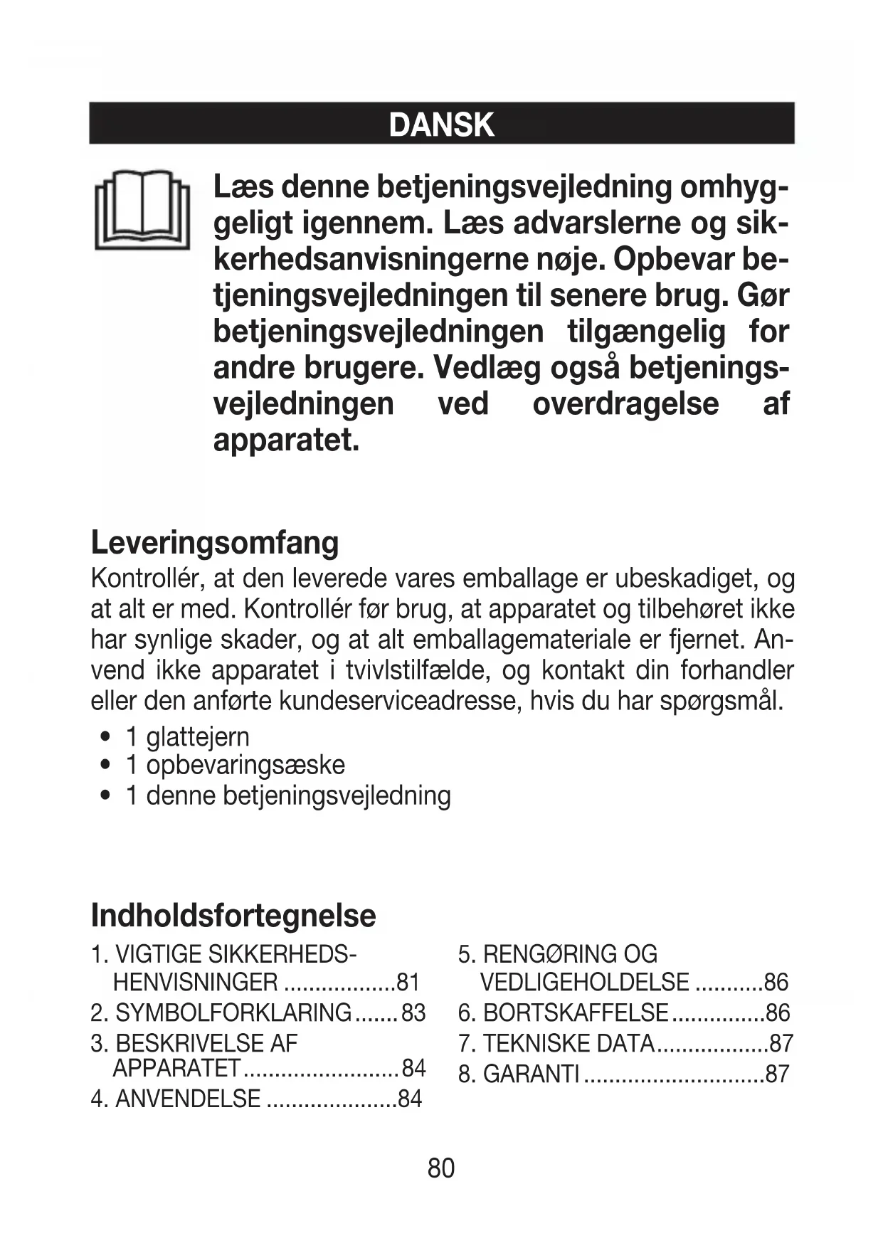 Meer informatie over de garantie en de garantievoorwaarden vindt u in het meegeleverde garantieblad. Fouten en wijzigingen voorbehouden80 DANSK Læs denne betjeningsvejledning omhyg- geligt igennem. Læs advarslerne og sik- kerhedsanvisningerne nøje. Opbevar be- tjeningsvejledningen til senere brug. Gør betjeningsvejledningen tilgængelig for andre brugere. Vedlæg også betjenings