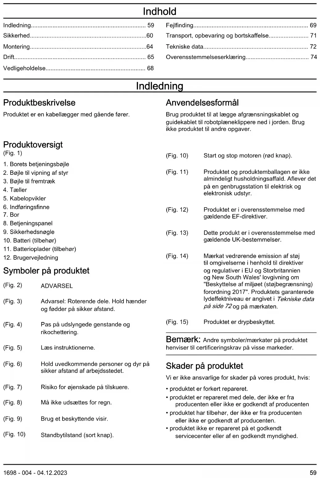 1698 - 004 - 04.12.2023• Lad ikke erfaringen fra tidligere brug af produkter gøre dig eftergivende, så du ignorerer sikkerhedsprincipperne for produktet. En uforsigtig handling kan give alvorlige skader på en brøkdel af et sekund. Brug og pleje af produktet