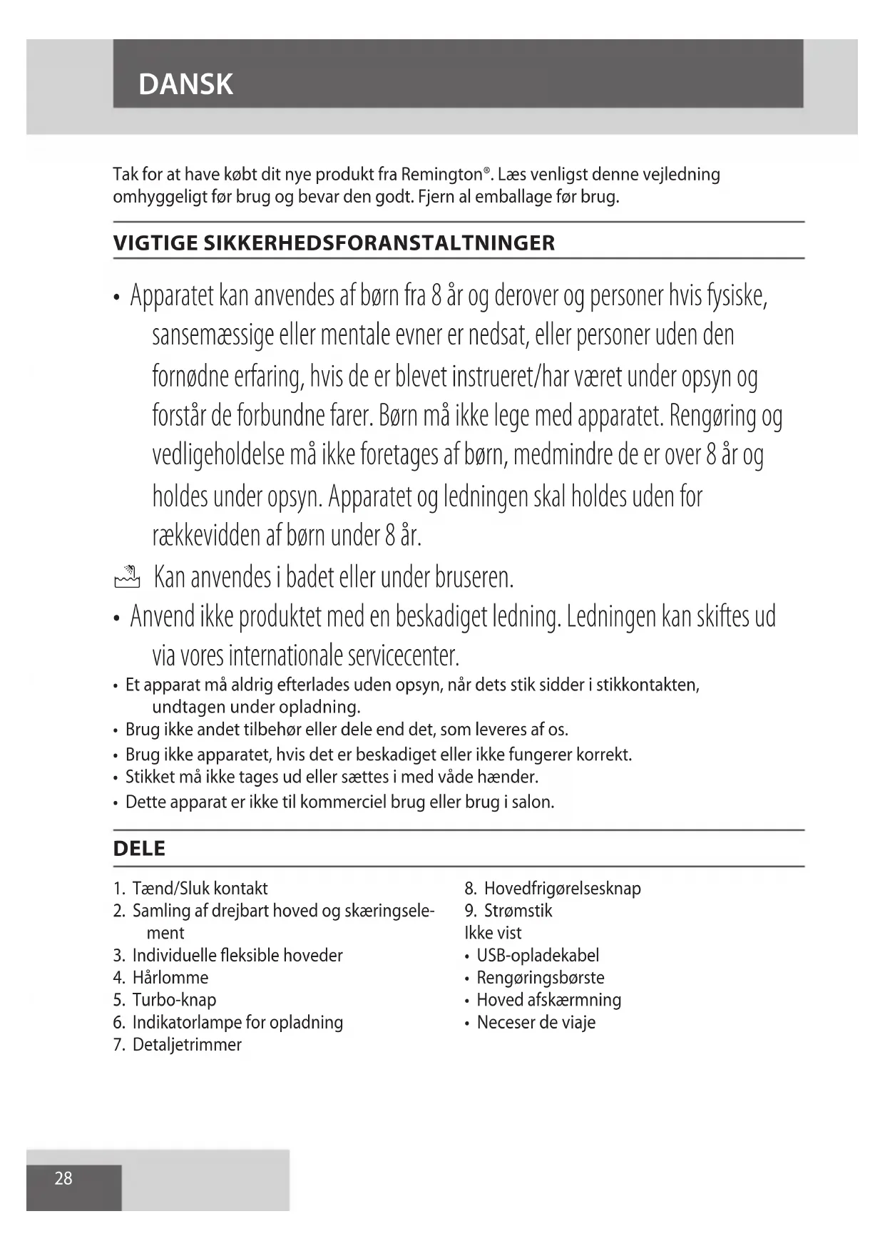 AE28 DANSK Tak for at have købt dit nye produkt fra Remington®. Læs venligst denne vejledning omhyggeligt før brug og bevar den godt. Fjern al emballage før brug. VIGTIGE SIKKERHEDSFORANSTALTNINGER