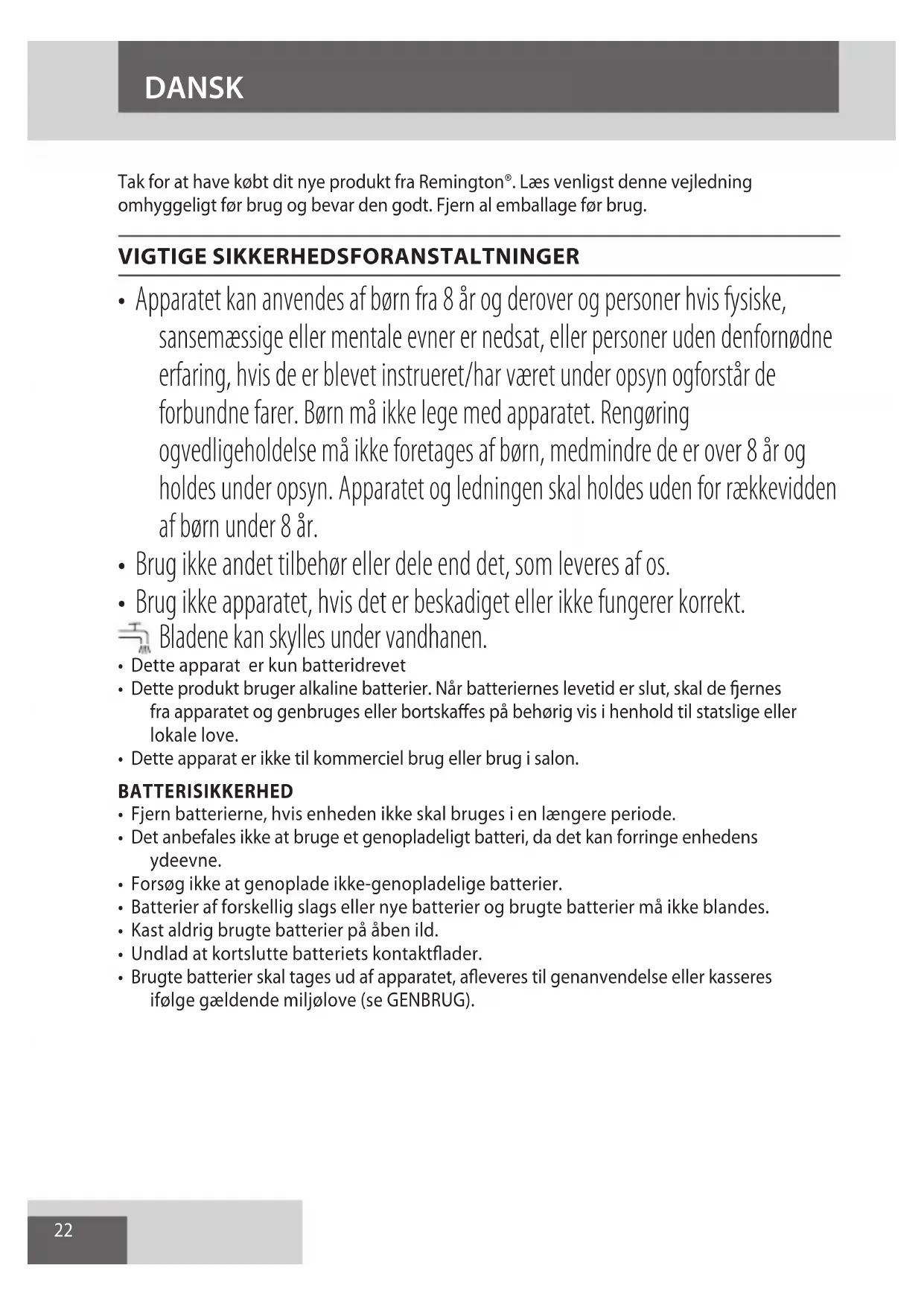 AE22 Tak for at have købt dit nye produkt fra Remington®. Læs venligst denne vejledning omhyggeligt før brug og bevar den godt. Fjern al emballage før brug. VIGTIGE SIKKERHEDSFORANSTALTNINGER