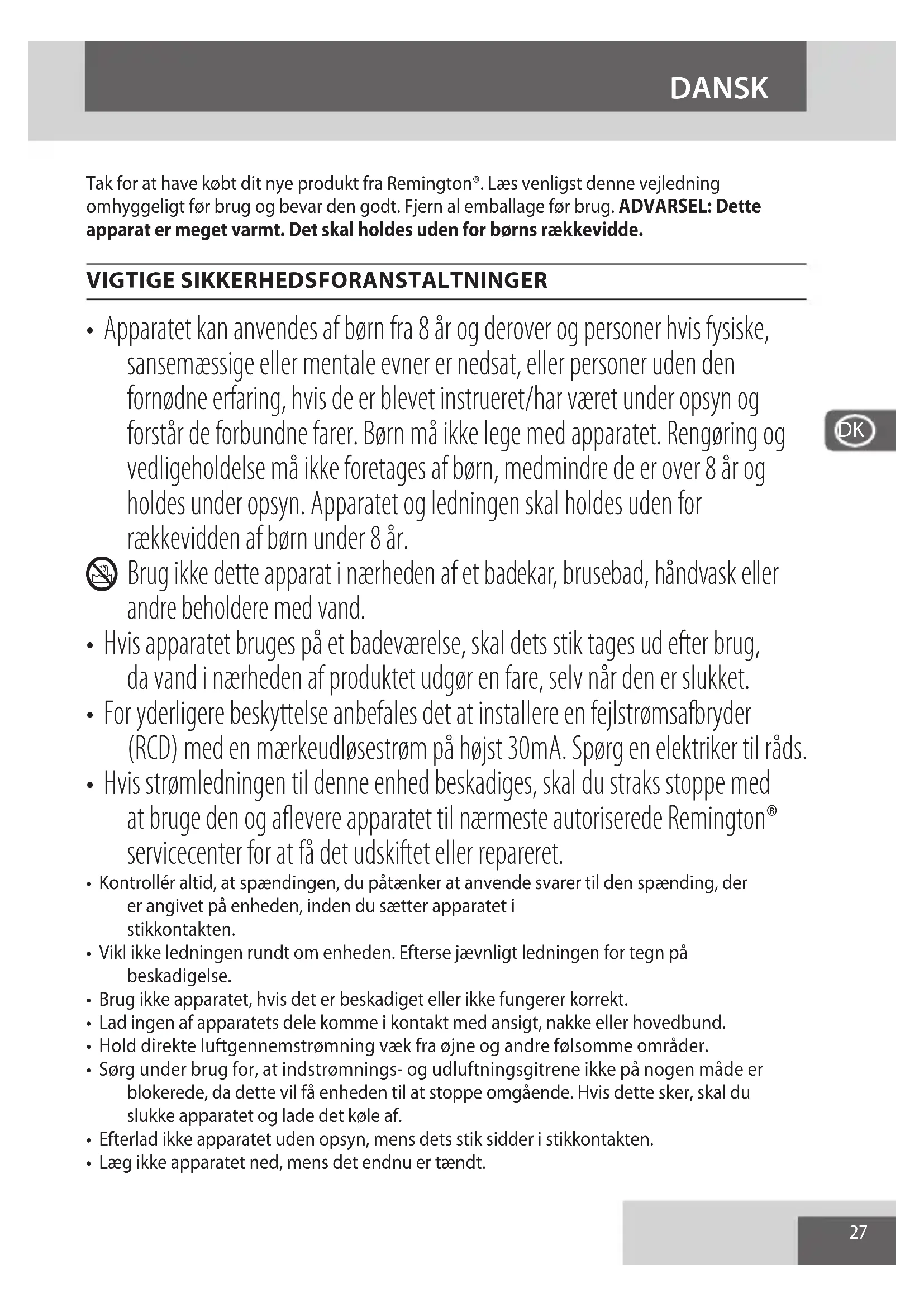 - Hvis strømledningen til denne enhed beskadiges, skal du straks stoppe med at bruge den og aflevere apparatet til nærmeste autoriserede Remington® servicecenter for at få det udskiftet eller repareret.