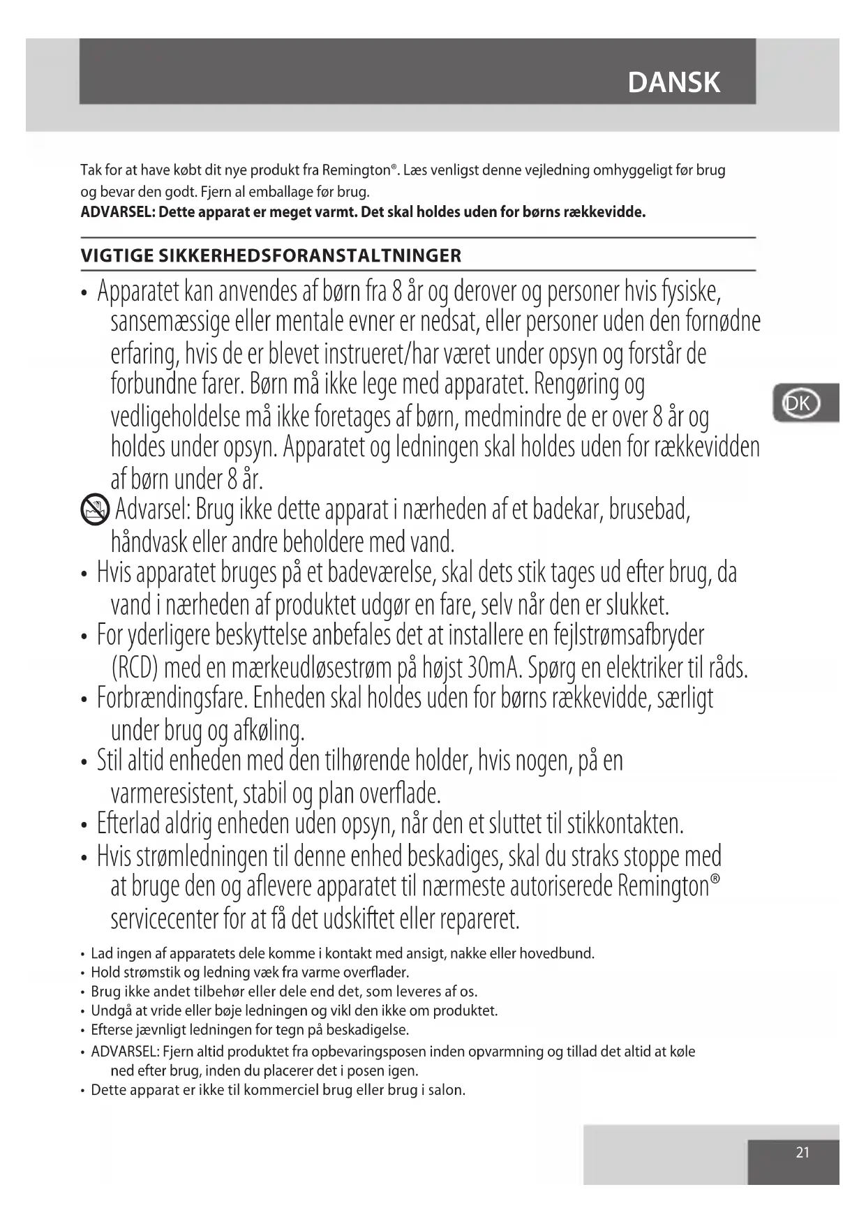 - Hvis strømledningen til denne enhed beskadiges, skal du straks stoppe med at bruge den og aflevere apparatet til nærmeste autoriserede Remington® servicecenter for at få det udskiftet eller repareret.