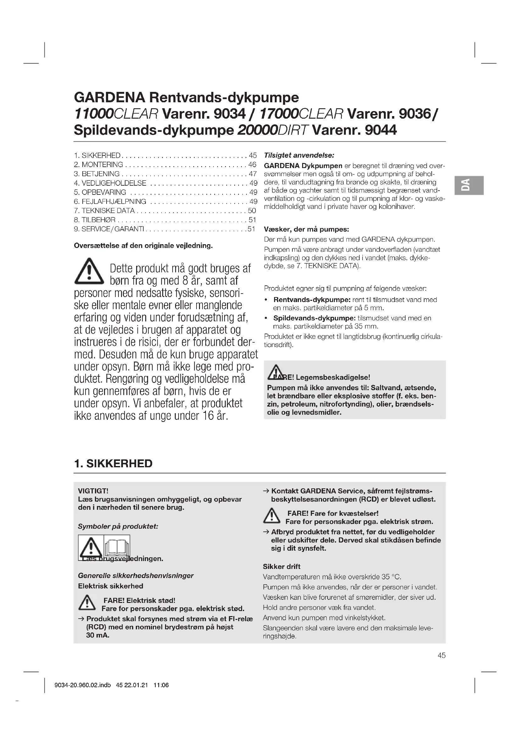 VIGTIGT! Læs brugsanvisningen omhyggeligt, og opbevar den i nærheden til senere brug. Symboler på produktet: Læs brugsvejledningen. Generelle sikkerhedshenvisninger Elektrisk sikkerhed FARE! Elektrisk stød! Fare for personskader pga. elektrisk stød. v Produktet skal forsynes med strøm via et FI-relæ (RCD) med en nominel brydestrøm på højst 30 mA. v Kontakt GARDENA Service, såfremt fejlstrøms- beskyttelsesanordningen (RCD) er blevet udløst. FARE! Fare for kvæstelser! Fare for personskader pga. elektrisk strøm. v Afbryd produktet fra nettet, før du vedligeholder eller udskifter dele. Derved skal stikdåsen befinde sig i dit synsfelt. Sikker drift Vandtemperaturen må ikke overskride 35 °C. Pumpen må ikke anvendes, når der er personer i vandet. Væsken kan blive forurenet af smøremidler, der siver ud. Hold andre personer væk fra vandet. Anvend kun pumpen med vinkelstykket. Slangeenden skal være lavere end den maksimale leve- ringshøjde. GARDENA Rentvands-dykpumpe 11000CLEAR Varenr. 9034 / 17000CLEAR Varenr. 9036 / Spildevands-dykpumpe 20000DIRT Varenr. 9044