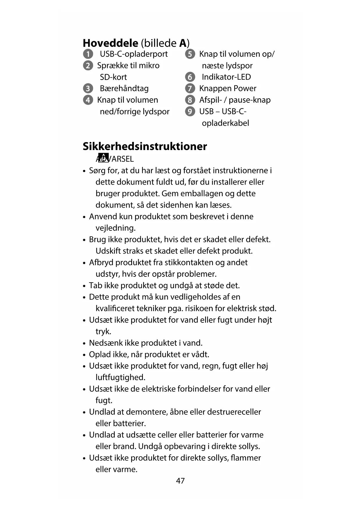 - Udsæt ikke produktet for vand, regn, fugt eller høj luftfugtighed.