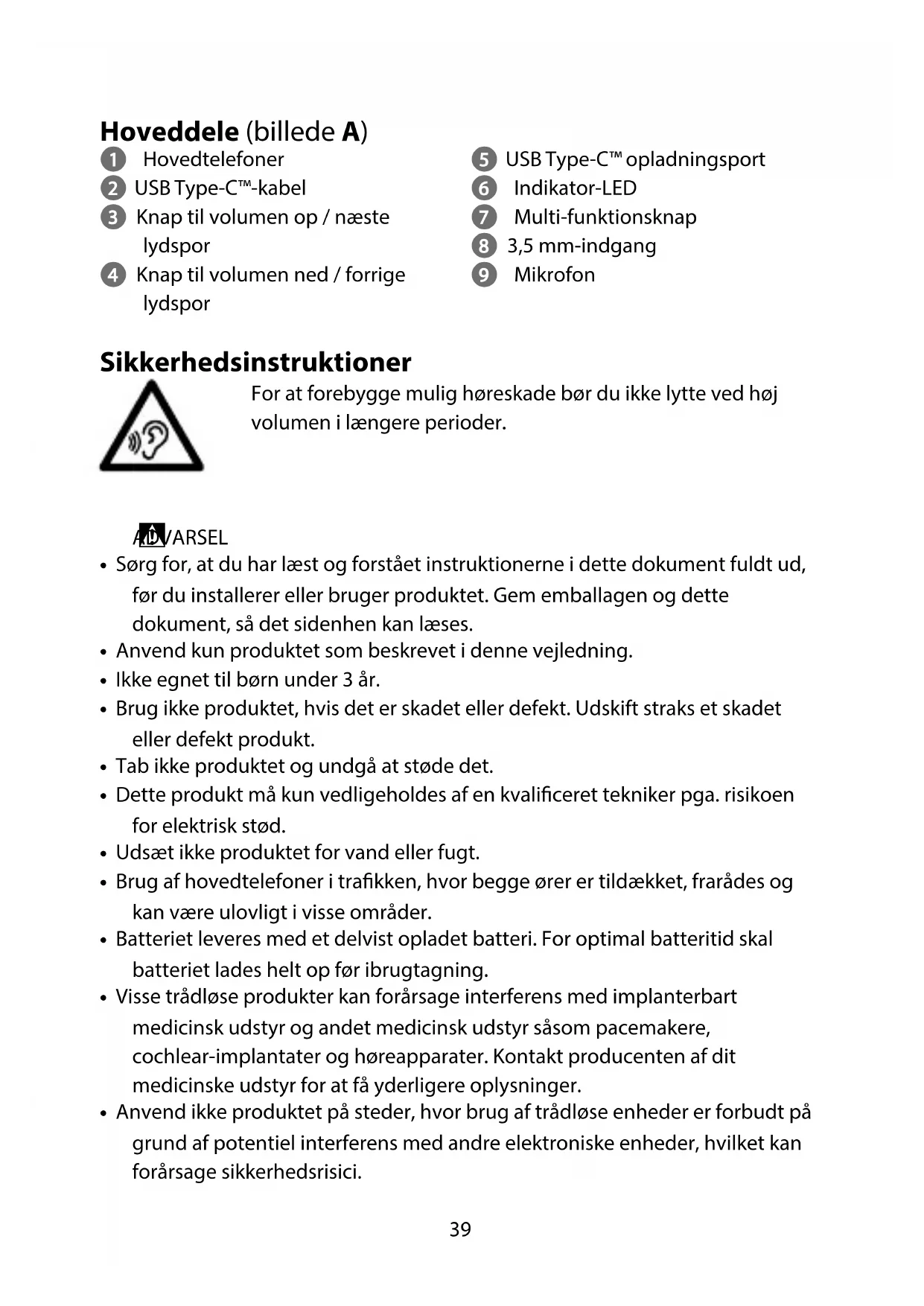 - Brug af hovedtelefoner i trakken, hvor begge ører er tildækket, frarådes og kan være ulovligt i visse områder.