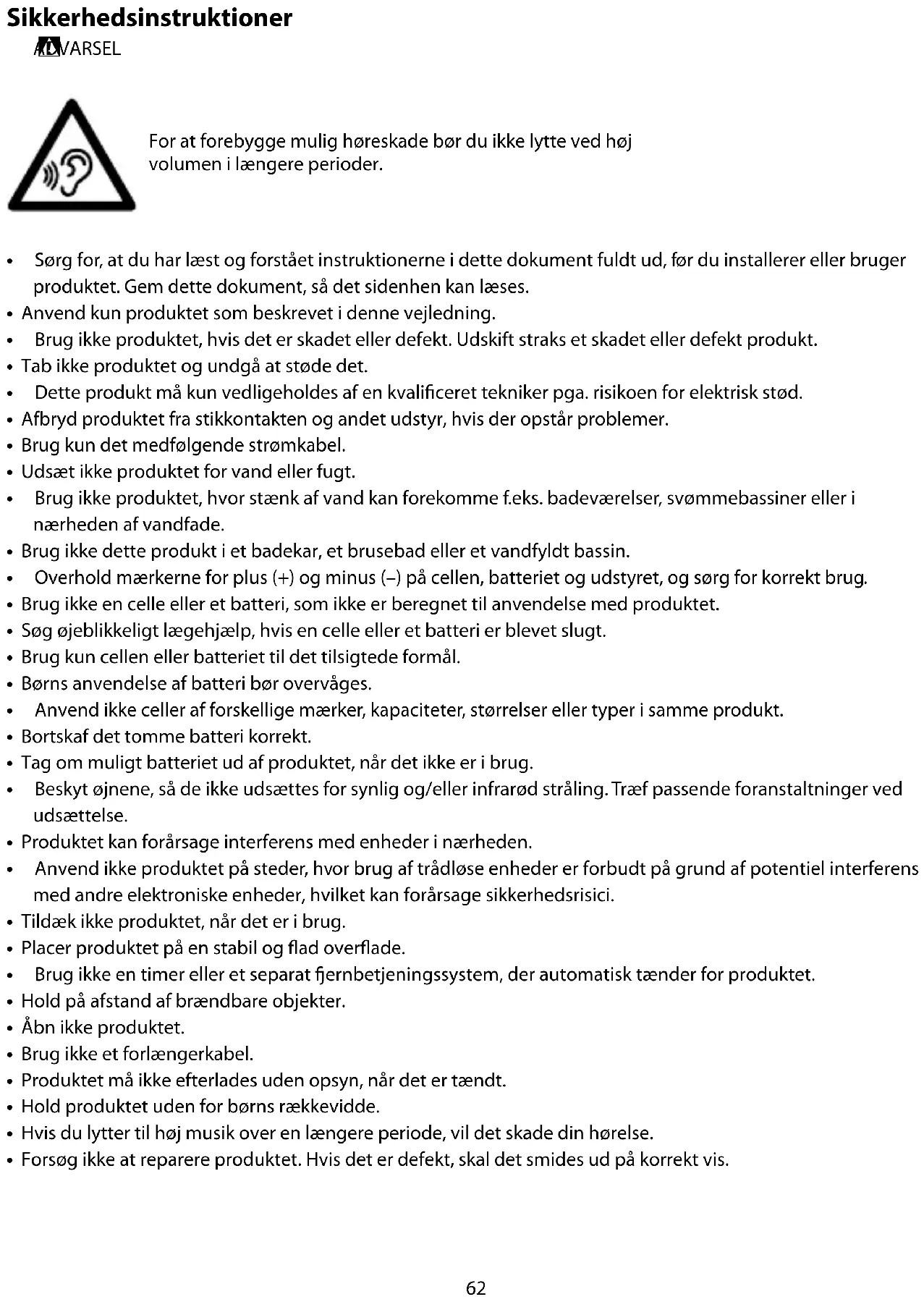 ADVARSEL For at forebygge mulig høreskade bør du ikke lytte ved høj volumen i længere perioder.