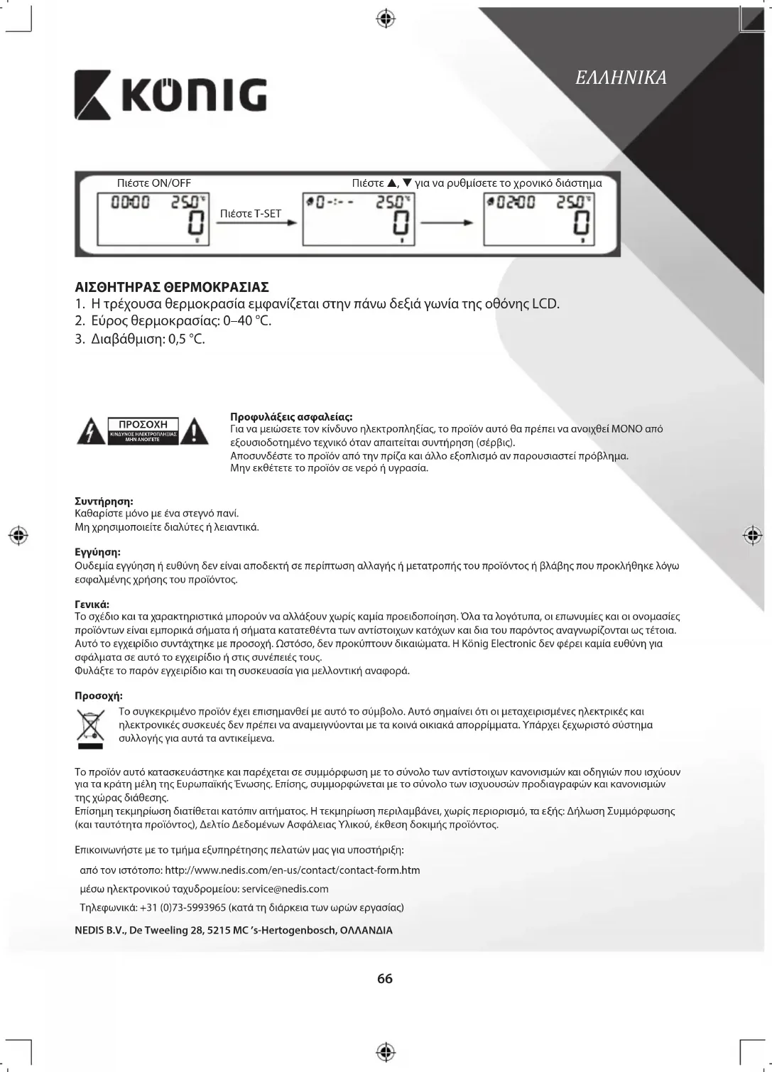 ÅBN IKKE Sikkerhedsforholdsregler: For at nedsætte risikoen for elektrisk stød, må dette produkt, f.eks. når der kræves service, KUN åbnes af en autoriseret tekniker. Frakobl produktet stikkontakten og andet udstyr, hvis der opstår et problem. Udsæt ikke produktet for vand eller fugt. Vedligeholdelse: Rengør kun med en tør klud. Brug ikke opløsningsmidler eller slibende rengøringsmidler. Garanti: Ingen garanti og ikke noget ansvar kan påtages for ændringer af produktet eller for skade på grund af forkert brug af dette produkt. Generelt: Design og specikationer kan ændres uden varsel. Alle bomærker og produktnavne er varemærker eller registrerede varemærker tilhørende deres respektive ejere og anses herved som sådan. Denne vejledning blev udført omhyggeligt. Imidlertid kan der ikke aedes nogen rettigheder. König Electronic kan ikke holdes ansvarlig for eventuelle fejl i denne vejledning eller deres konsekvenser. Gem brugervejledningen og emballagen til senere brug. Bemærk: Dette produkt er mærket med dette symbol. Det betyder, at brugt elektrisk og elektronisk udstyr ikke må bortskaes sammen med almindeligt husholdningsaald. Der ndes særlige indsamlingssystemer for disse produkter. Dette produkt er fremstillet og leveres i overensstemmelse med alle relevante forordninger og direktiver, der er gældende for alle EUs medlemsstater. Produktet overholder ligeledes alle gældende specikationer og forskrifter i de lande, hvor produktet sælges. Formel dokumentation kan fremlægges på forlangende. Dette omfatter, men er ikke begrænset til: Overensstemmelseserklæring (og produkt-ID), Sikkerhedsdatablad, testrapport for produktet. Kontakt venligst vores kundeservice for support: via hjemmeside: http://www.nedis.dk/da-dk/kontakt/kontaktformular.htm via e-mail: service@nedis.com via telefon: +31 (0)73-5993965 (i kontortiden) NEDIS B.V., De Tweeling 28, 5215 MC ’s-Hertogenbosch, NEDERLANDENE72 NORSK AUTOMATISK AVSTENGING Automatisk avstenging skjer hvis skjermen viser “0” eller viser samme vekt i 2minutter. MANUELL AVSTENGING For å maksimere batterienes levetid bør du alltid trykke på ON/OFF for å slå av vekten etter bruk. VARSELINDIKATORER