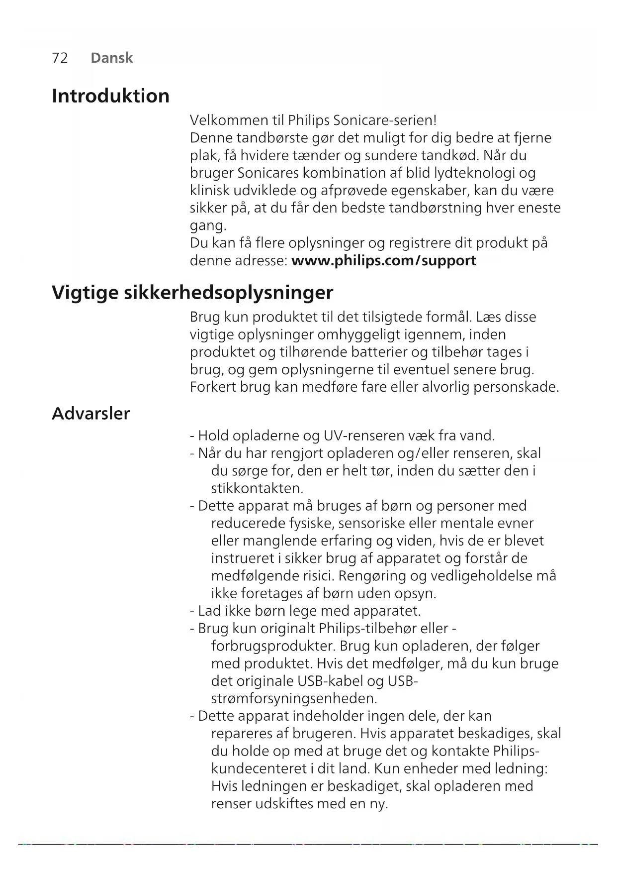 Dansk Introduktion Velkommen til Philips Sonicare-serien! Denne tandbørste gør det muligt for dig bedre at fjerne plak, få hvidere tænder og sundere tandkød. Når du bruger Sonicares kombination af blid lydteknologi og klinisk udviklede og afprøvede egenskaber, kan du være sikker på, at du får den bedste tandbørstning hver eneste gang. Du kan få flere oplysninger og registrere dit produkt på denne adresse: www.philips.com/support Vigtige sikkerhedsoplysninger Brug kun produktet til det tilsigtede formål. Læs disse vigtige oplysninger omhyggeligt igennem, inden produktet og tilhørende batterier og tilbehør tages i brug, og gem oplysningerne til eventuel senere brug. Forkert brug kan medføre fare eller alvorlig personskade. Advarsler - Hold opladerne og UV-renseren væk fra vand. - Når du har rengjort opladeren og/eller renseren, skal du sørge for, den er helt tør, inden du sætter den i stikkontakten. - Dette apparat må bruges af børn og personer med reducerede fysiske, sensoriske eller mentale evner eller manglende erfaring og viden, hvis de er blevet instrueret i sikker brug af apparatet og forstår de medfølgende risici. Rengøring og vedligeholdelse må ikke foretages af børn uden opsyn. - Lad ikke børn lege med apparatet. - Brug kun originalt Philips-tilbehør eller - forbrugsprodukter. Brug kun opladeren, der følger med produktet. Hvis det medfølger, må du kun bruge det originale USB-kabel og USB- strømforsyningsenheden. - Dette apparat indeholder ingen dele, der kan repareres af brugeren. Hvis apparatet beskadiges, skal du holde op med at bruge det og kontakte Philips- kundecenteret i dit land. Kun enheder med ledning: Hvis ledningen er beskadiget, skal opladeren med renser udskiftes med en ny.73 Dansk - Opladeren og/eller renseren må ikke bruges udendørs eller tæt på varme overflader. - Hverken dele eller tilbehør til produktet må kommes i opvaskemaskinen. - Apparatet er kun beregnet til renholdelse af tænder, tandkød og tunge. - Hold altid renseren uden for børns rækkevidde. - Stop med at bruge renseren, hvis det ultraviolette lys forbliver tændt, når lågen åbnes. Ultraviolet lys kan være skadeligt for øjne og hud. - Betjen kun renseren med beskyttelsesskærmen på plads. - Rør ikke ved UV-renserens ultraviolette pære, når den er varm. - Stop med at bruge et børstehoved, der har ødelagte eller bøjede børstehår. Udskift børstehovedet hver 3. måned, eller så snart de første tegn på slitage viser sig. - Undgå direkte kontakt med produkter, der indeholder æteriske olier eller kokosolie. Kontakt kan resultere i, at der falder totter af børsten. - Stop med at bruge apparatet, og kontakt din tandlæge/læge, hvis der opstår kraftig blødning efter brug, hvis blødningen fortsætter efter 1 uges brug, eller hvis du oplever ubehag eller smerter. - Hvis du er blevet opereret i mund eller tandkød inden for de seneste 2 måneder, skal du spørge din tandlæge til råds, før du bruger apparatet. - Hvis du har en pacemaker eller andre implantater, skal du kontakte din læge eller producenten af implantatet inden brug. - Hvis du har helbredsproblemer, skal du spørge din læge til råds, før du begynder at bruge dette apparat. - Dette produkt er beregnet til personlig hjemmebrug og ikke til brug af et større antal patienter på tandlægeklinikker eller institutioner. Sikkerhedsinstruktioner for batterier - Dette apparat indeholder batterier, der kun kan udskiftes af kompetente personer.74 Dansk - Brug kun produktet til det tilsigtede formål. Læs disse oplysninger omhyggeligt igennem, inden produktet og tilhørende batterier og tilbehør tages i brug, og gem oplysningerne til eventuel senere brug. Forkert brug kan medføre fare eller alvorlig personskade. Det medfølgende tilbehør kan variere for forskellige produkter. - Brug kun originalt Philips-tilbehør og forbrugsprodukter. Brug kun den aftagelige forsyningsenhed TCBxxxx, HX6100, HX6110, HX6160 eller WAAxxxx. - Hold produktet og batterierne væk fra ild, og udsæt dem ikke for direkte sollys eller høje temperaturer. - Hvis produktet bliver unormalt varmt eller lugtende, ændrer farve, eller opladningen tager længere end normalt, skal du ophøre med at bruge og oplade produktet og kontakte Philips. - Du må ikke komme produkter og deres batterier i mikroovne eller placere dem på induktionskogeplader. - For at forhindre, at batterierne overophedes eller afgiver giftstoffer eller farlige substanser, må du ikke åbne, ændre eller slå hul på, beskadige eller skille produktet eller batteriet ad. Batterierne må ikke kortsluttes, overoplades eller udsættes for omvendt elektrisk ladning. - Dette apparat indeholder batterier, der ikke kan udskiftes. Når batteriet har nået enden af sin levetid, skal apparatet bortskaffes på korrekt vis. Se afsnittet om genanvendelse. - Hvis batterierne er ødelagt eller lækker, skal du undgå kontakt med hud og øjne. Hvis dette sker, skal du straks skylle grundigt med vand og søge lægehjælp. - Når du håndterer batterier, skal du sørge for, at dine hænder, produktet og batterierne er tørre. - For at undgå en utilsigtet kortslutning af batterierne efter fjernelse, må du ikke lade batteripolerne komme i kontakt med metalgenstande (f.eks. mønter, hårnåle, ringe). Batterierne må ikke pakkes ind i aluminiumsfolie. Sæt tape på batteripolerne, eller læg batterierne i en plastikpose, før du kasserer dem.75 Dansk - Oplad og brug produktet ved en temperatur mellem 0 °C og 40 °C. Opbevarings- og transportbetingelser Temperatur -10°C til 60°C. Elektromagnetiske felter (EMF) Dette Philips-apparat overholder alle branchens gældende standarder og regler angående eksponering for elektromagnetiske felter. Direktiv om radioudstyr Hermed erklærer Philips, at elektriske tandbørster med radioudstyrstype (Bluetooth, NFC) er i overensstemmelse med direktiv 2014/53/EU. - Bluetooth-radiogrænsefladen i relevante produkter har en driftsf