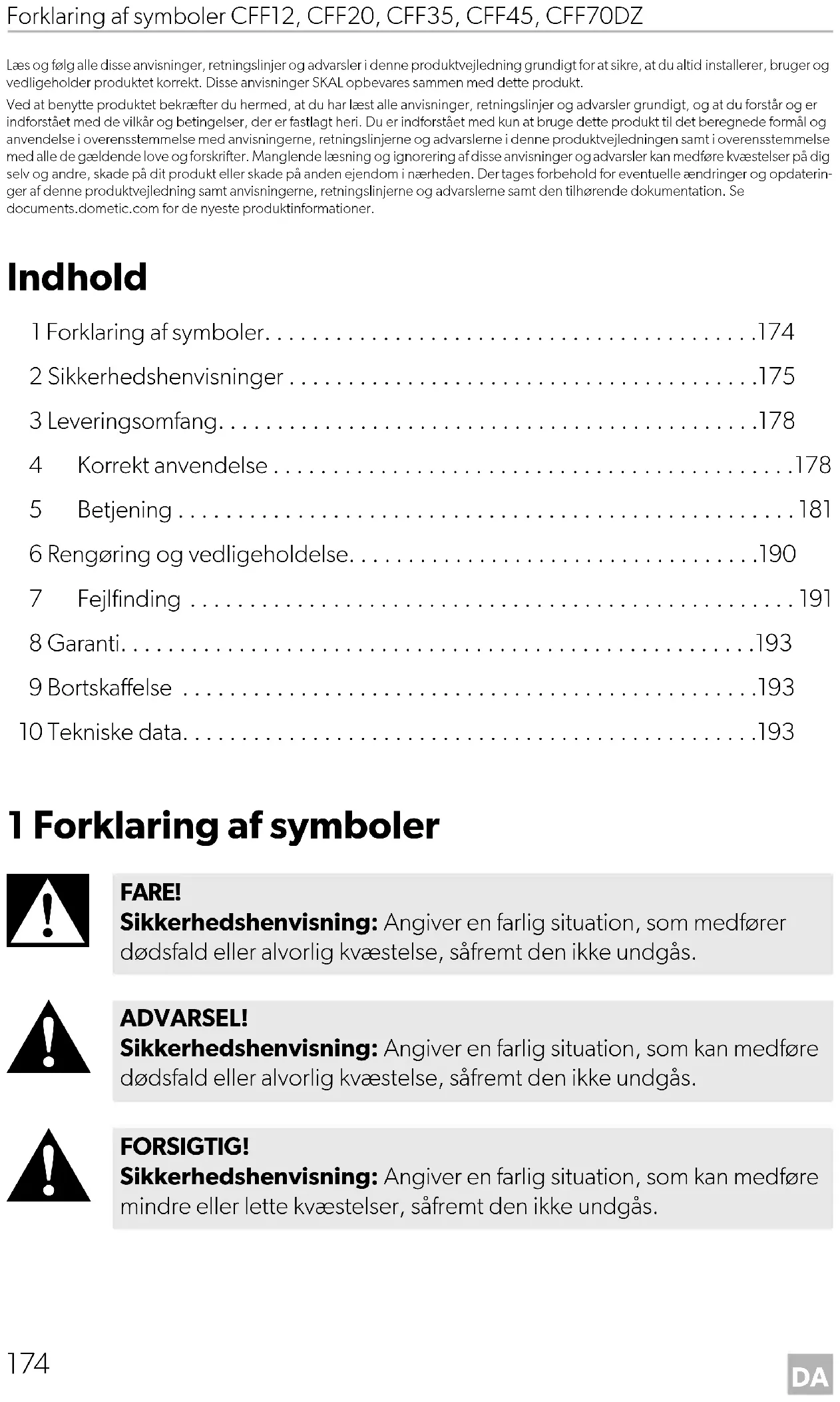 FARE! Sikkerhedshenvisning: Angiver en farlig situation, som medfører dødsfald eller alvorlig kvæstelse, såfremt den ikke undgås. ADVARSEL! Sikkerhedshenvisning: Angiver en farlig situation, som kan medføre dødsfald eller alvorlig kvæstelse, såfremt den ikke undgås. FORSIGTIG! Sikkerhedshenvisning: Angiver en farlig situation, som kan medføre mindre eller lette kvæstelser, såfremt den ikke undgås. DometicCFF12-20-35-45-70DZ_OPM_4445103134_EMEA17_202x-xx-xx.book Page 174 Friday, September 16, 2022 12:19 PMDA CFF12, CFF20, CFF35, CFF45, CFF70DZ Sikkerhedshenvisninger