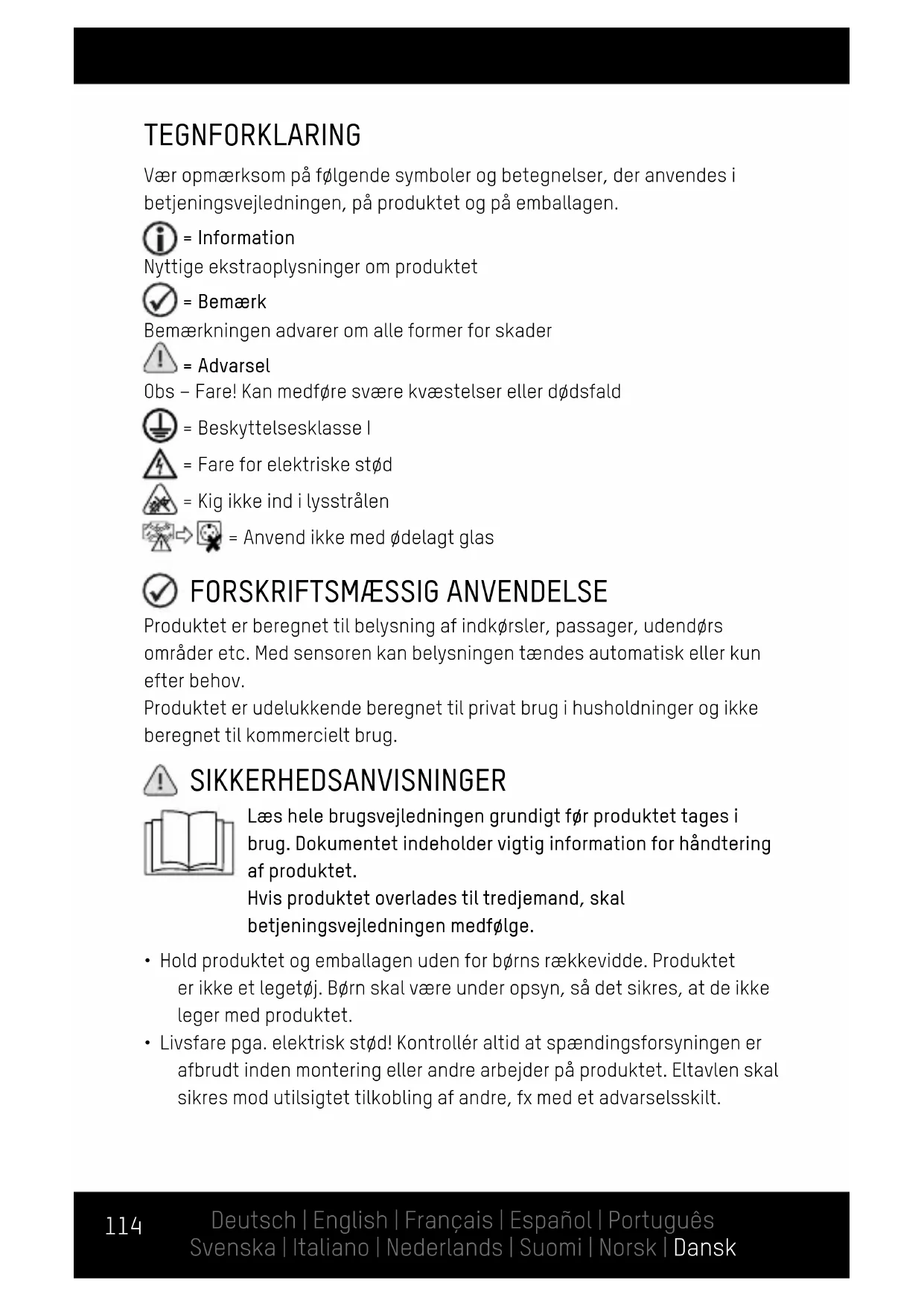 Produktet er beregnet til belysning af indkørsler, passager, udendørs områder etc. Med sensoren kan belysningen tændes automatisk eller kun efter behov. Produktet er udelukkende beregnet til privat brug i husholdninger og ikke beregnet til kommercielt brug. SIKKERHEDSANVISNINGER Læs hele brugsvejledningen grundigt før produktet tages i brug. Dokumentet indeholder vigtig information for håndtering af produktet. Hvis produktet overlades til tredjemand, skal betjeningsvejledningen medfølge.