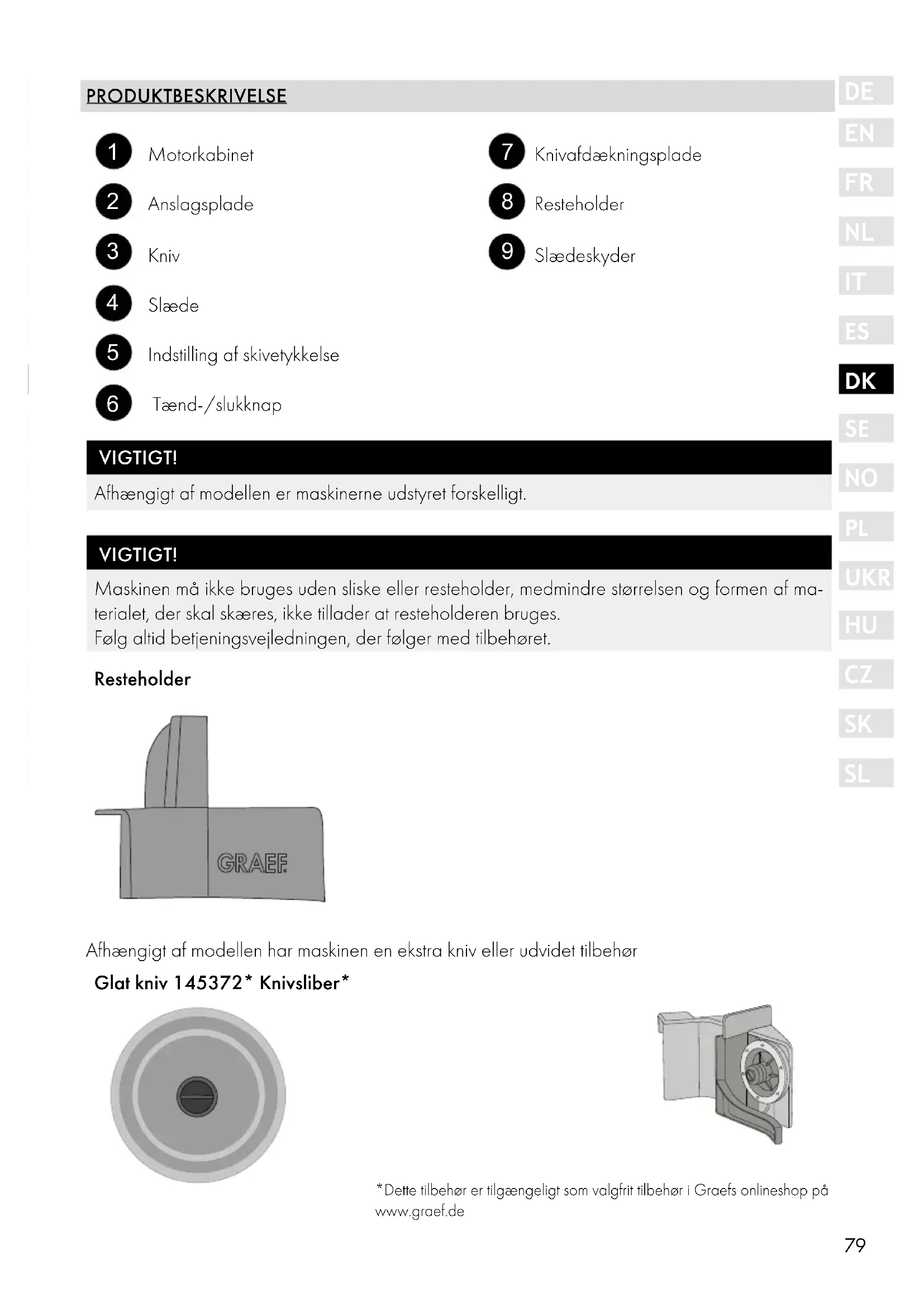 Tænd-/slukknap VIGTIGT! Afhængigt af modellen er maskinerne udstyret forskelligt. VIGTIGT! Maskinen må ikke bruges uden sliske eller resteholder, medmindre størrelsen og formen af ma- terialet, der skal skæres, ikke tillader at resteholderen bruges. Følg altid betjeningsvejledningen, der følger med tilbehøret. Resteholder Afhængigt af modellen har maskinen en ekstra kniv eller udvidet tilbehør Glat kniv 145372* Knivsliber* *Dette tilbehør er tilgængeligt som valgfrit tilbehør i Graefs onlineshop på www.graef.de80 FORORD Kære kunde, Ved købet af denne pålægsmaskine, har du gjort et godt valg. Du har købt et anerkendt kvalitets- produkt. Vi takker for dit køb, og ønsker dig masser af glæde med din nye Graef-pålægsmaskine.