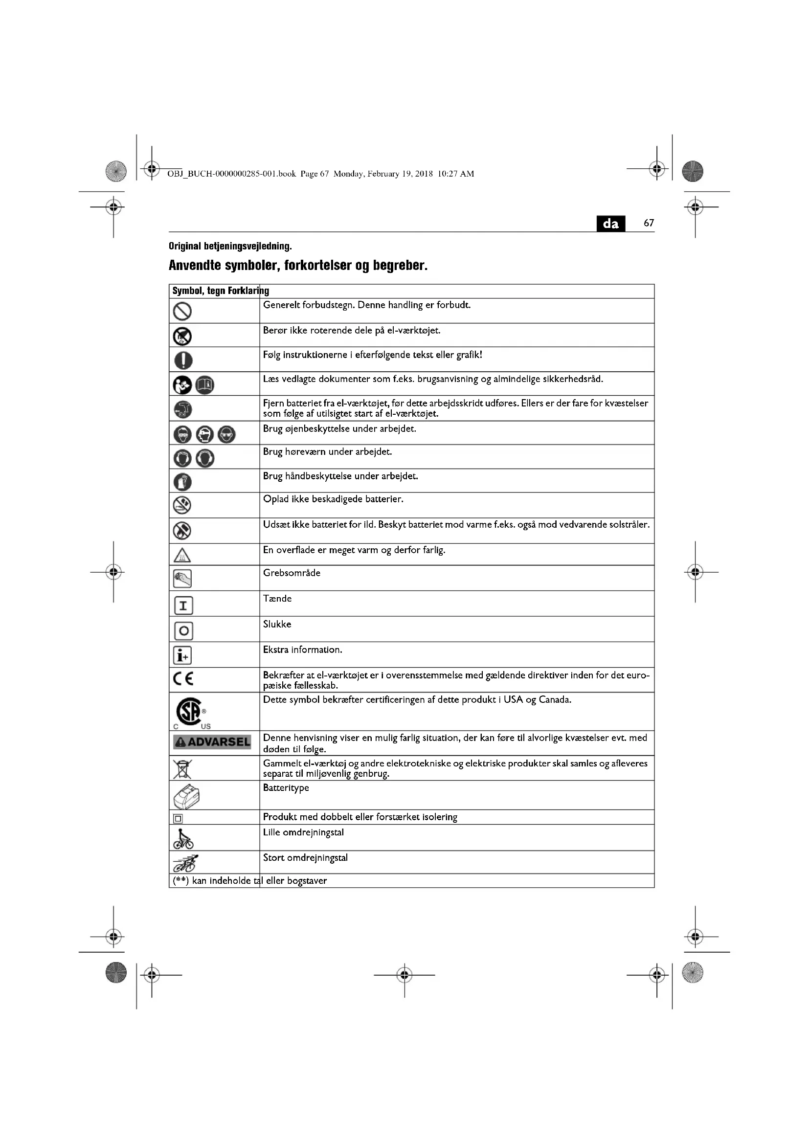 Original betjeningsvejledning. Anvendte symboler, forkortelser og begreber. Symbol, tegn Forklaring Generelt forbudstegn. Denne handling er forbudt. Berør ikke roterende dele på el-værktøjet. Følg instruktionerne i efterfølgende tekst eller grafik! Læs vedlagte dokumenter som f.eks. brugsanvisning og almindelige sikkerhedsråd. Fjern batteriet fra el-værktøjet, før dette arbejdsskridt udføres. Ellers er der fare for kvæstelser som følge af utilsigtet start af el-værktøjet. Brug øjenbeskyttelse under arbejdet. Brug høreværn under arbejdet. Brug håndbeskyttelse under arbejdet. Oplad ikke beskadigede batterier. Udsæt ikke batteriet for ild. Beskyt batteriet mod varme f.eks. også mod vedvarende solstråler. En overflade er meget varm og derfor farlig. Grebsområde Tænde Slukke Ekstra information. Bekræfter at el-værktøjet er i overensstemmelse med gældende direktiver inden for det euro- pæiske fællesskab. Dette symbol bekræfter certificeringen af dette produkt i USA og Canada. Denne henvisning viser en mulig farlig situation, der kan føre til alvorlige kvæstelser evt. med døden til følge. Gammelt el-værktøj og andre elektrotekniske og elektriske produkter skal samles og afleveres separat til miljøvenlig genbrug. Batteritype Produkt med dobbelt eller forstærket isolering Lille omdrejningstal Stort omdrejningstal (**) kan indeholde tal eller bogstaver OBJ_BUCH-0000000285-001.book Page 67 Monday, February 19, 2018 10:27 AM68