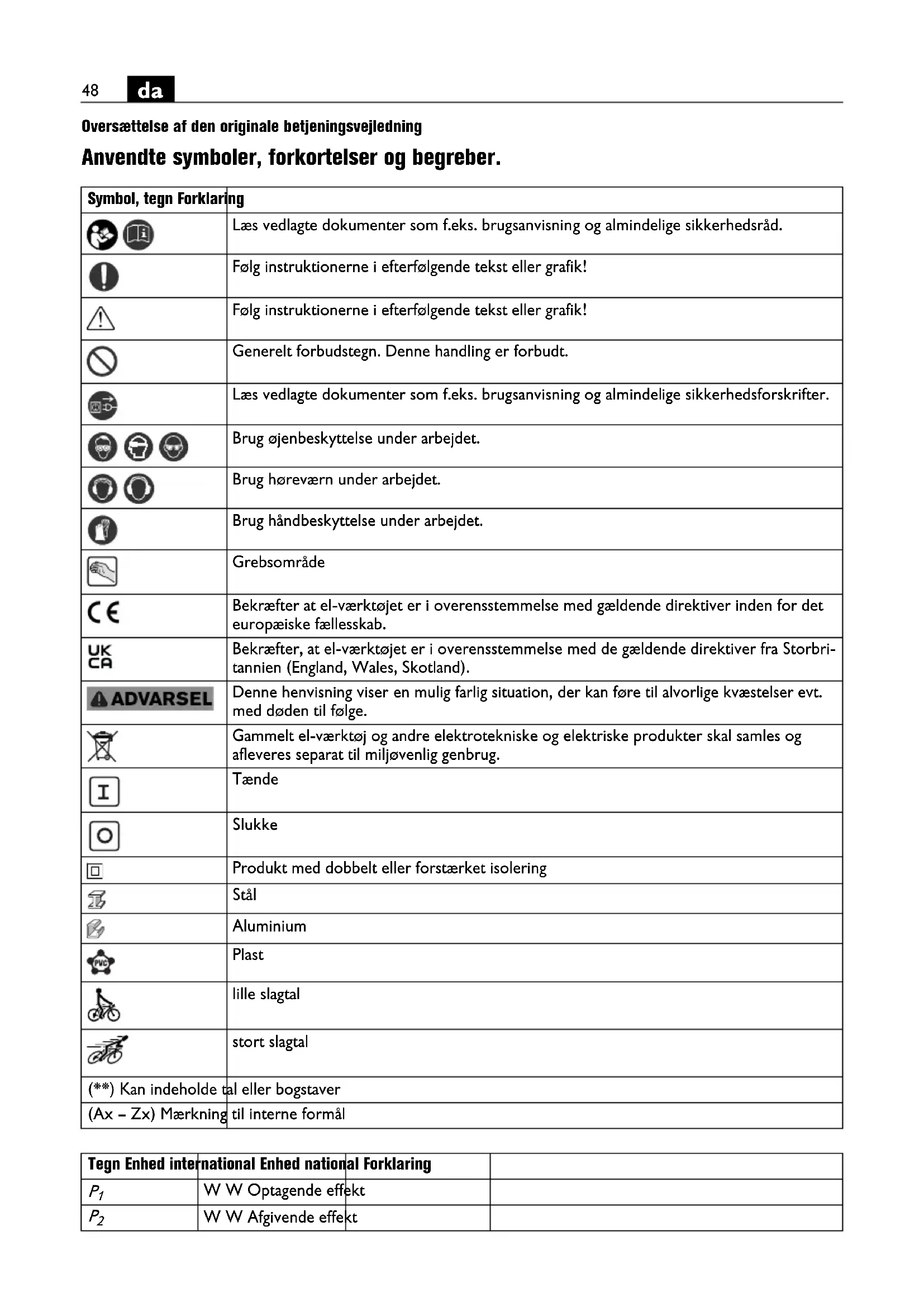 Oversættelse af den originale betjeningsvejledning Anvendte symboler, forkortelser og begreber. Symbol, tegn Forklaring Læs vedlagte dokumenter som f.eks. brugsanvisning og almindelige sikkerhedsråd. Følg instruktionerne i efterfølgende tekst eller grafik! Følg instruktionerne i efterfølgende tekst eller grafik! Generelt forbudstegn. Denne handling er forbudt. Læs vedlagte dokumenter som f.eks. brugsanvisning og almindelige sikkerhedsforskrifter. Brug øjenbeskyttelse under arbejdet. Brug høreværn under arbejdet. Brug håndbeskyttelse under arbejdet. Grebsområde Bekræfter at el-værktøjet er i overensstemmelse med gældende direktiver inden for det europæiske fællesskab. Bekræfter, at el-værktøjet er i overensstemmelse med de gældende direktiver fra Storbri- tannien (England, Wales, Skotland). Denne henvisning viser en mulig farlig situation, der kan føre til alvorlige kvæstelser evt. med døden til følge. Gammelt el-værktøj og andre elektrotekniske og elektriske produkter skal samles og afleveres separat til miljøvenlig genbrug. Tænde Slukke Produkt med dobbelt eller forstærket isolering Stål Aluminium Plast lille slagtal stort slagtal (**) Kan indeholde tal eller bogstaver (Ax – Zx) Mærkning til interne formål Tegn Enhed international Enhed national Forklaring