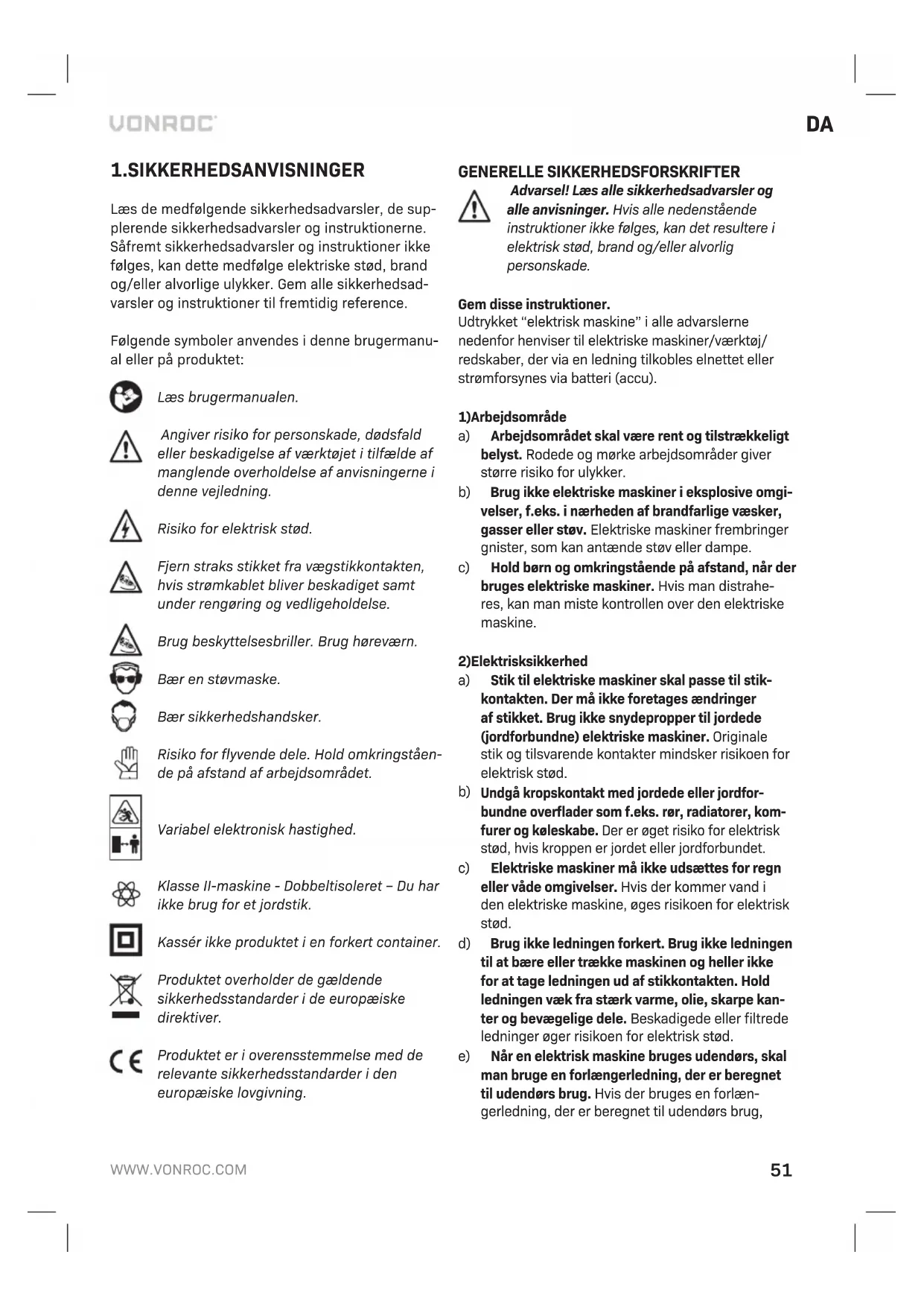 Læs de medfølgende sikkerhedsadvarsler, de sup- plerende sikkerhedsadvarsler og instruktionerne. Såfremt sikkerhedsadvarsler og instruktioner ikke følges, kan dette medfølge elektriske stød, brand og/eller alvorlige ulykker. Gem alle sikkerhedsad- varsler og instruktioner til fremtidig reference. Følgende symboler anvendes i denne brugermanu- al eller på produktet: Læs brugermanualen. Angiver risiko for personskade, dødsfald eller beskadigelse af værktøjet i tilfælde af manglende overholdelse af anvisningerne i denne vejledning. Risiko for elektrisk stød. Fjern straks stikket fra vægstikkontakten, hvis strømkablet bliver beskadiget samt under rengøring og vedligeholdelse. Brug beskyttelsesbriller. Brug høreværn. Bær en støvmaske. Bær sikkerhedshandsker. Risiko for flyvende dele. Hold omkringståen- de på afstand af arbejdsområdet. Variabel elektronisk hastighed. Klasse II-maskine - Dobbeltisoleret – Du har ikke brug for et jordstik. Kassér ikke produktet i en forkert container. Produktet overholder de gældende sikkerhedsstandarder i de europæiske direktiver. Produktet er i overensstemmelse med de relevante sikkerhedsstandarder i den europæiske lovgivning. GENERELLE SIKKERHEDSFORSKRIFTER Advarsel! Læs alle sikkerhedsadvarsler og alle anvisninger. Hvis alle nedenstående instruktioner ikke følges, kan det resultere i elektrisk stød, brand og/eller alvorlig personskade. Gem disse instruktioner. Udtrykket “elektrisk maskine” i alle advarslerne nedenfor henviser til elektriske maskiner/værktøj/ redskaber, der via en ledning tilkobles elnettet eller strømforsynes via batteri (accu).