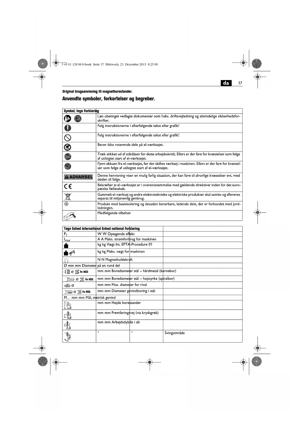 Original brugsanvisning til magnetborestander. Anvendte symboler, forkortelser og begreber. Symbol, tegn Forklaring Læs ubetinget vedlagte dokumenter som f.eks. driftsvejledning og almindelige sikkerhedsfor- skrifter. Følg instruktionerne i efterfølgende tekst eller grafik! Følg instruktionerne i efterfølgende tekst eller grafik! Berør ikke roterende dele på el-værktøjet. Træk stikket ud af stikdåsen før dette arbejdsskridt. Ellers er der fare for kvæstelser som følge af utilsigtet start af el-værktøjet. Fjern akkuen fra el-værktøjet, før der skiftes værktøj i maskinen. Ellers er der fare for kvæstel- ser som følge af utilsigtet start af el-værktøjet. Denne henvisning viser en mulig farlig situation, der kan føre til alvorlige kvæstelser evt. med døden til følge. Bekræfter at el-værktøjet er i overensstemmelse med gældende direktiver inden for det euro- pæiske fællesskab. Gammelt el-værktøj og andre elektrotekniske og elektriske produkter skal samles og afleveres separat til miljøvenlig genbrug. Produkt med basisisolering og desuden berørbare, ledende dele, der er forbundet med jord- ledningen. Medfølgende tilbehør Tegn Enhed international Enhed national Forklaring