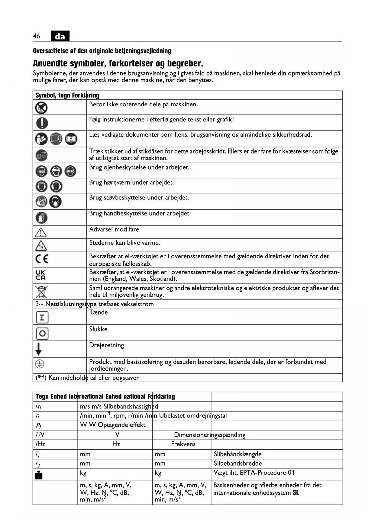 Oversættelse af den originale betjeningsvejledning Anvendte symboler, forkortelser og begreber. Symbolerne, der anvendes i denne brugsanvisning og i givet fald på maskinen, skal henlede din opmærksomhed på mulige farer, der kan opstå med denne maskine, når den benyttes. Symbol, tegn Forklaring Berør ikke roterende dele på maskinen. Følg instruktionerne i efterfølgende tekst eller grafik! Læs vedlagte dokumenter som f.eks. brugsanvisning og almindelige sikkerhedsråd. Træk stikket ud af stikdåsen før dette arbejdsskridt. Ellers er der fare for kvæstelser som følge af utilsigtet start af maskinen. Brug øjenbeskyttelse under arbejdet. Brug høreværn under arbejdet. Brug støvbeskyttelse under arbejdet. Brug håndbeskyttelse under arbejdet. Advarsel mod fare Stederne kan blive varme. Bekræfter at el-værktøjet er i overensstemmelse med gældende direktiver inden for det europæiske fællesskab. Bekræfter, at el-værktøjet er i overensstemmelse med de gældende direktiver fra Storbritan- nien (England, Wales, Skotland). Saml udrangerede maskiner og andre elektrotekniske og elektriske produkter og aflever det hele til miljøvenlig genbrug. 3~ Nettilslutningstype trefaset vekselstrøm Tænde Slukke Drejeretning Produkt med basisisolering og desuden berørbare, ledende dele, der er forbundet med jordledningen. (**) Kan indeholde tal eller bogstaver Tegn Enhed international Enhed national Forklaring