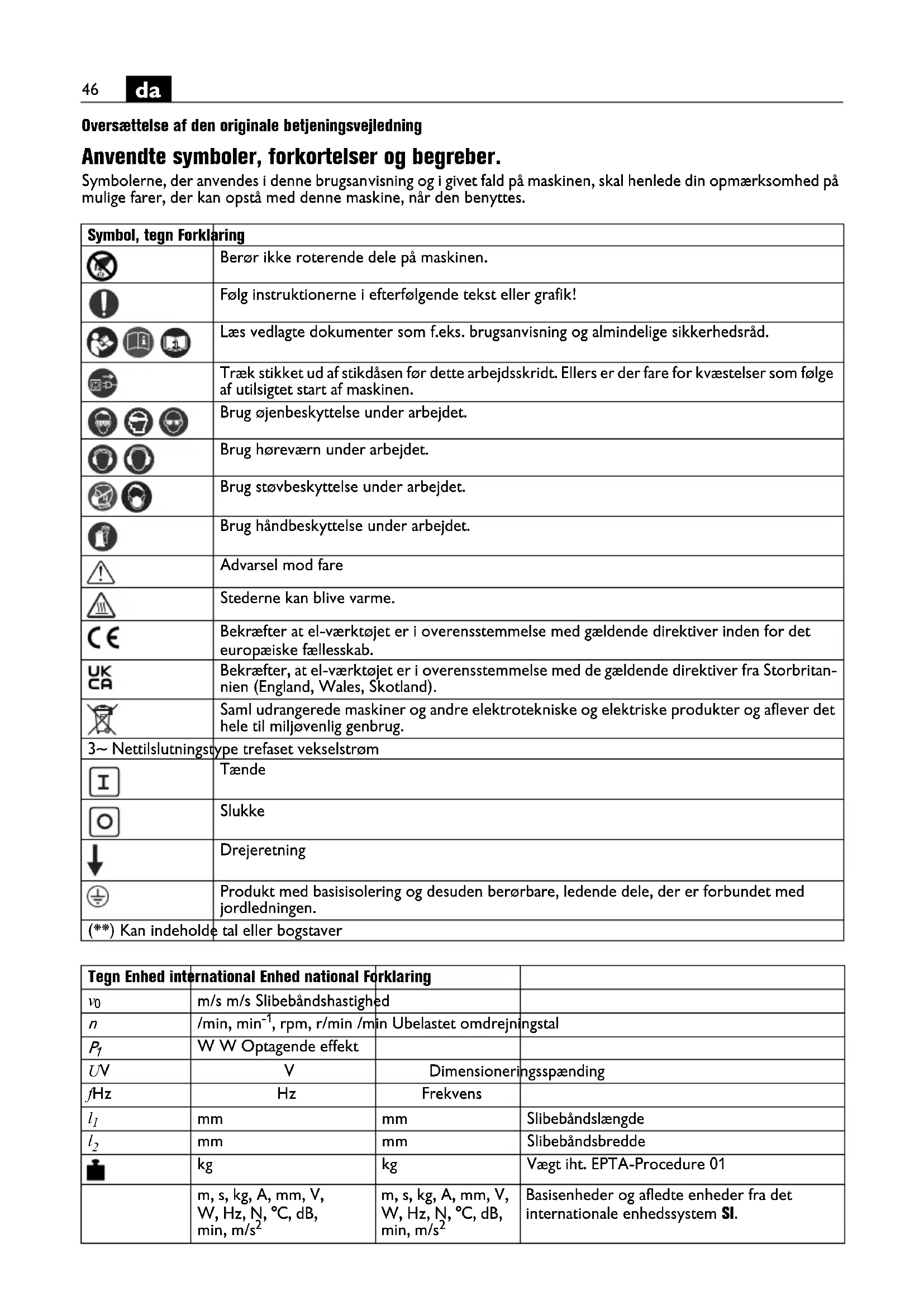 Oversættelse af den originale betjeningsvejledning Anvendte symboler, forkortelser og begreber. Symbolerne, der anvendes i denne brugsanvisning og i givet fald på maskinen, skal henlede din opmærksomhed på mulige farer, der kan opstå med denne maskine, når den benyttes. Symbol, tegn Forklaring Berør ikke roterende dele på maskinen. Følg instruktionerne i efterfølgende tekst eller grafik! Læs vedlagte dokumenter som f.eks. brugsanvisning og almindelige sikkerhedsråd. Træk stikket ud af stikdåsen før dette arbejdsskridt. Ellers er der fare for kvæstelser som følge af utilsigtet start af maskinen. Brug øjenbeskyttelse under arbejdet. Brug høreværn under arbejdet. Brug støvbeskyttelse under arbejdet. Brug håndbeskyttelse under arbejdet. Advarsel mod fare Stederne kan blive varme. Bekræfter at el-værktøjet er i overensstemmelse med gældende direktiver inden for det europæiske fællesskab. Bekræfter, at el-værktøjet er i overensstemmelse med de gældende direktiver fra Storbritan- nien (England, Wales, Skotland). Saml udrangerede maskiner og andre elektrotekniske og elektriske produkter og aflever det hele til miljøvenlig genbrug. 3~ Nettilslutningstype trefaset vekselstrøm Tænde Slukke Drejeretning Produkt med basisisolering og desuden berørbare, ledende dele, der er forbundet med jordledningen. (**) Kan indeholde tal eller bogstaver Tegn Enhed international Enhed national Forklaring