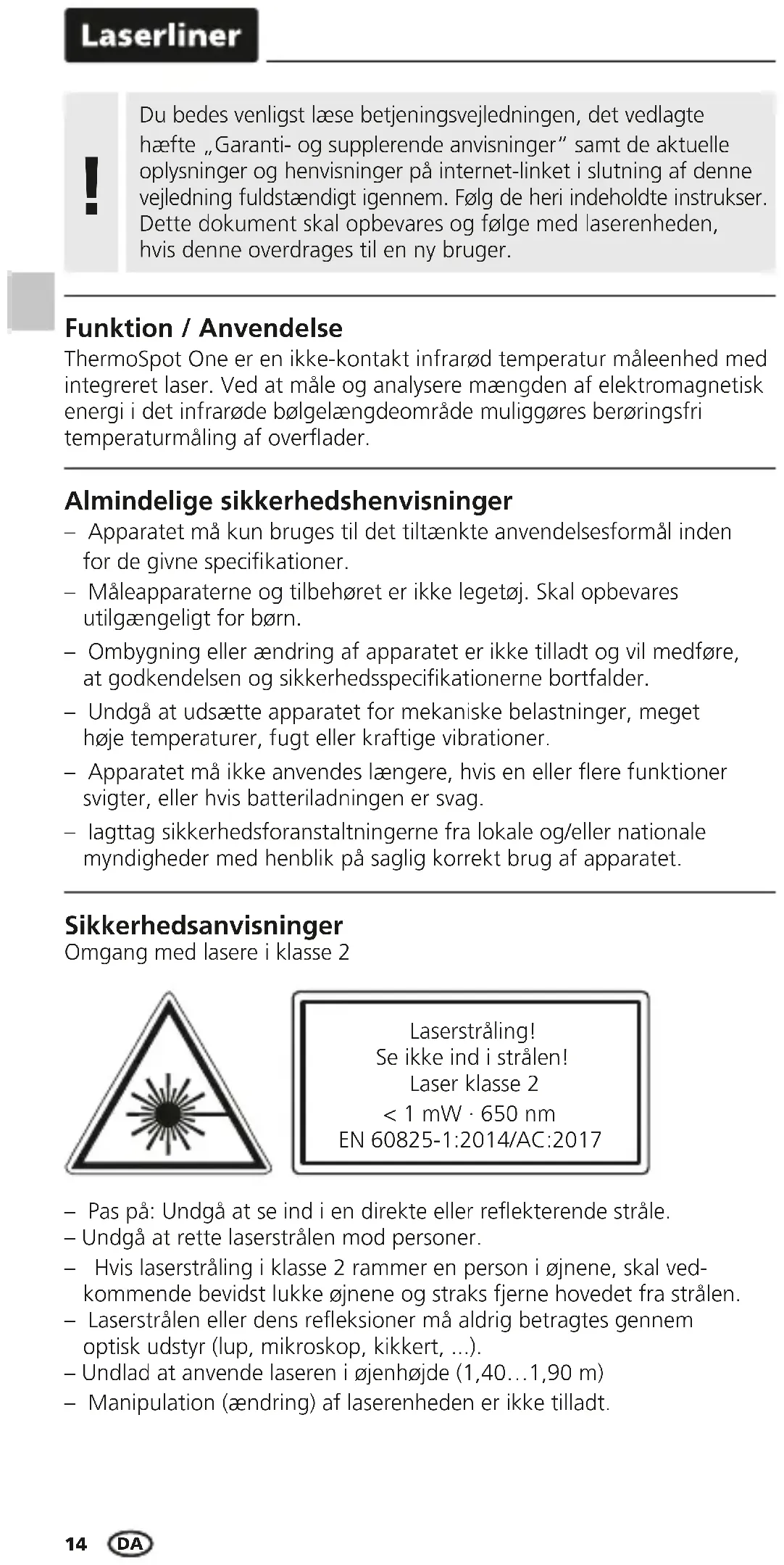 Funktion / Anvendelse ThermoSpot One er en ikke-kontakt infrarød temperatur måleenhed med integreret laser. Ved at måle og analysere mængden af elektromagnetisk energi i det infrarøde bølgelængdeområde muliggøres berøringsfri temperaturmåling af overader. – Pas på: Undgå at se ind i en direkte eller reekterende stråle. – Undgå at rette laserstrålen mod personer. – Hvis laserstråling i klasse 2 rammer en person i øjnene, skal ved- kommende bevidst lukke øjnene og straks fjerne hovedet fra strålen. – Laserstrålen eller dens reeksioner må aldrig betragtes gennem optisk udstyr (lup, mikroskop, kikkert, ...). – Undlad at anvende laseren i øjenhøjde (1,40…1,90 m) – Manipulation (ændring) af laserenheden er ikke tilladt. Sikkerhedsanvisninger Omgang med lasere i klasse 2 Almindelige sikkerhedshenvisninger – Apparatet må kun bruges til det tiltænkte anvendelsesformål inden for de givne specikationer. – Måleapparaterne og tilbehøret er ikke legetøj. Skal opbevares utilgængeligt for børn. – Ombygning eller ændring af apparatet er ikke tilladt og vil medføre, at godkendelsen og sikkerhedsspecikationerne bortfalder. – Undgå at udsætte apparatet for mekaniske belastninger, meget høje temperaturer, fugt eller kraftige vibrationer. – Apparatet må ikke anvendes længere, hvis en eller ere funktioner svigter, eller hvis batteriladningen er svag. – Iagttag sikkerhedsforanstaltningerne fra lokale og/eller nationale myndigheder med henblik på saglig korrekt brug af apparatet. Du bedes venligst læse betjeningsvejledningen, det vedlagte hæfte „Garanti- og supplerende anvisninger“ samt de aktuelle oplysninger og henvisninger på internet-linket i slutning af denne vejledning fuldstændigt igennem. Følg de heri indeholdte instrukser. Dette dokument skal opbevares og følge med laserenheden, hvis denne overdrages til en ny bruger.