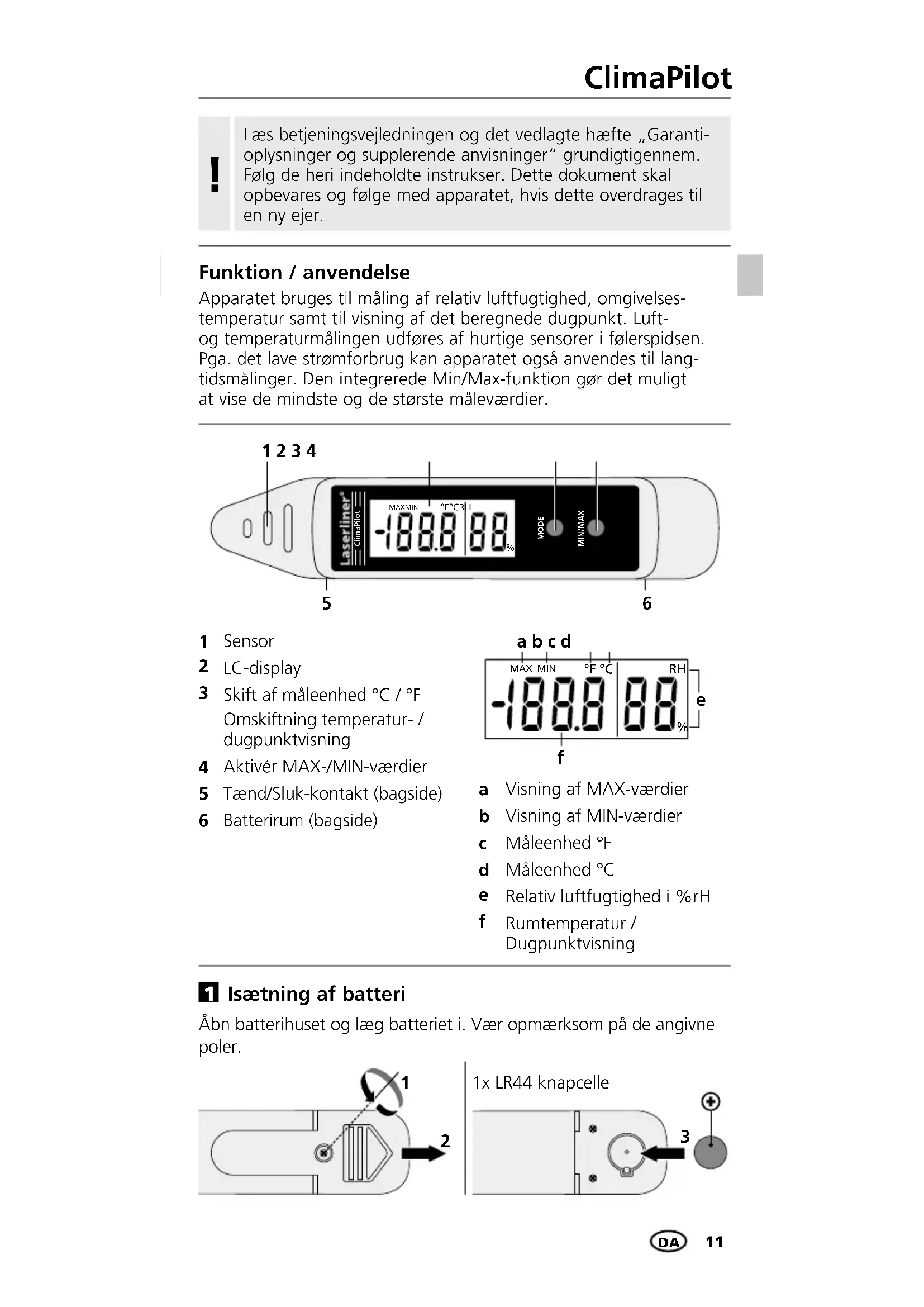 ON / OFF Til at stille kontakten (5) på ON. Apparatet viser omgivelsestemperaturen og den relative luftfugtighed. °C / °F Man indstiller den ønskede temperaturenhed ved at holde knappen „MODE“ inde i 2 sekunder, indtil det ønskede symbol vises på displayet. MAX / MIN Dugpunktvisning Man bestemmer de maksimale eller minimale måleværdier under en måling ved at trykke på knappen „MAX / MIN“, indtil „MAX“ el. „MIN“ vises på displayet. Den normale målemodus er indstillet, når der ikke blinker nogen funktion på displayet. Når man trykker kortvarigt på knappen „MODE“, vises det målte dugpunkt. Bemærk – Produktet er et præcisionsinstrument, der skal behandles med omhu. Undgå stød og rystelser samt eksponering for ekstrem varme eller kulde. – Undgå direkte kontakt med væsker. – Benyt en let fugtet, blød klud til rengøring.ClimaPilot